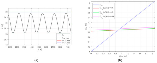 By satisfying conditions 3a and 3b above, it follows that the absolute values in both and are bounded. From condition 1, the boundedness of implies that is also bounded. From Equation (7), if is bounded, is also bounded. Finally, from (1) and assuming constant external disturbances, the boundedness of and ensures is also bounded. In this work, it is assumed that remains constant, given that, under typical operating conditions, disturbances such as fouling or salinity variations occur at sufficiently slow rates to be approximated as constant. Wave action is assumed to primarily affect depth measurement accuracy rather than buoyancy, as depth is commonly sensed via pressure sensors. Vertical currents may influence the buoyancy force, but, except in highly dynamic shallow waters, they are not expected to exhibit rapid variations. Furthermore, if these disturbances exhibit abrupt transitions at infrequent time instants, the corresponding time-derivatives are non-zero only at those particular time instants. Consequently, such behavior does not compromise system stability. It is therefore shown that satisfying conditions 3a and 3b ensures that the state of Equation (4) remains bounded in the Lyapunov sense [34]: