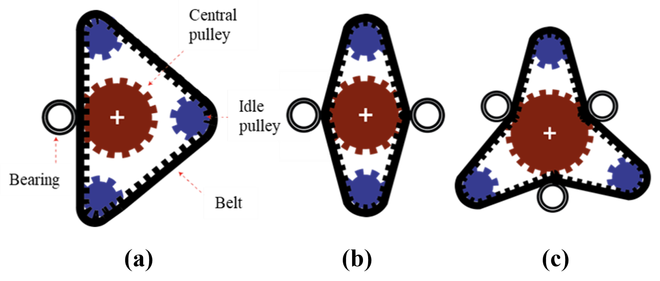 Figure 3b is more compact and requires fewer parts, making it more suitable for the proposed actuator design. Bearings or rollers can be employed to maintain proper contact between the timing belt and the central pulleys. Keeping