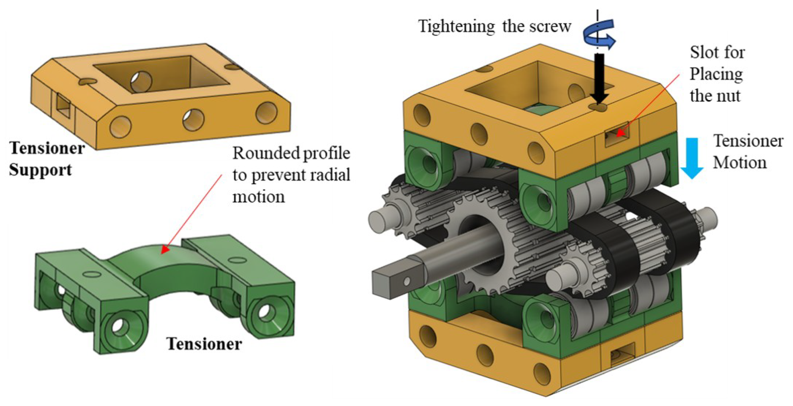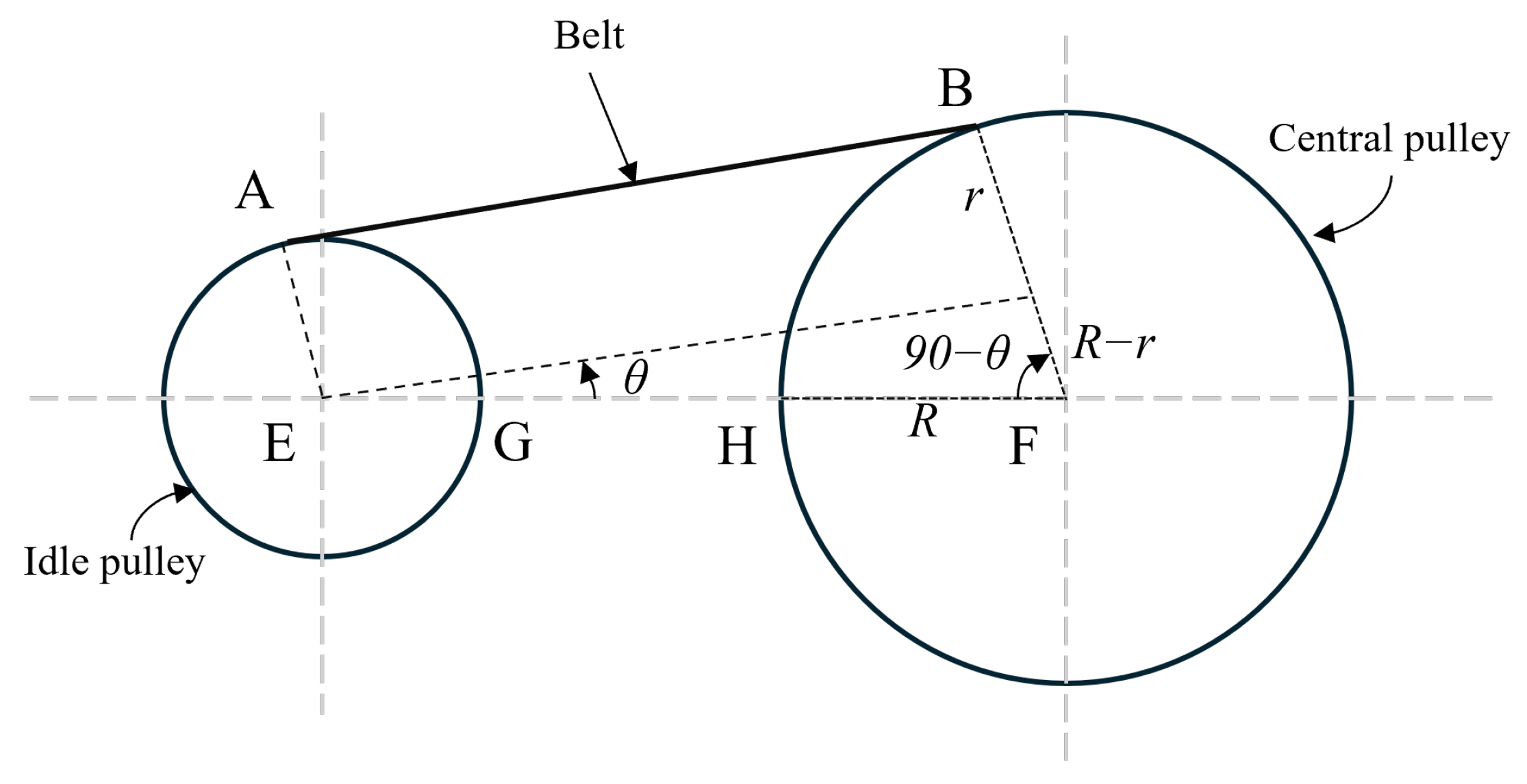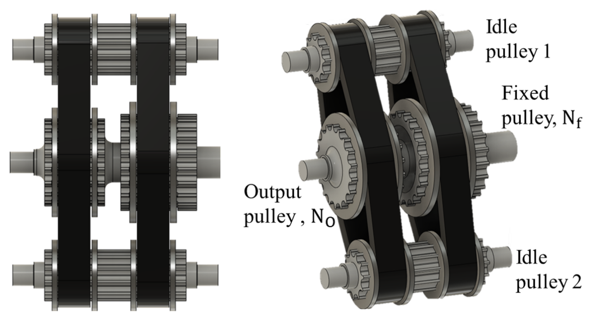 Figure 4. Since both belts are deformed by the same idle pulleys with an equal number of teeth, they move at the same speed, preserving the operational principle of the system. However, belt tensions may differ, requiring an independent tension adjustment for each belt.