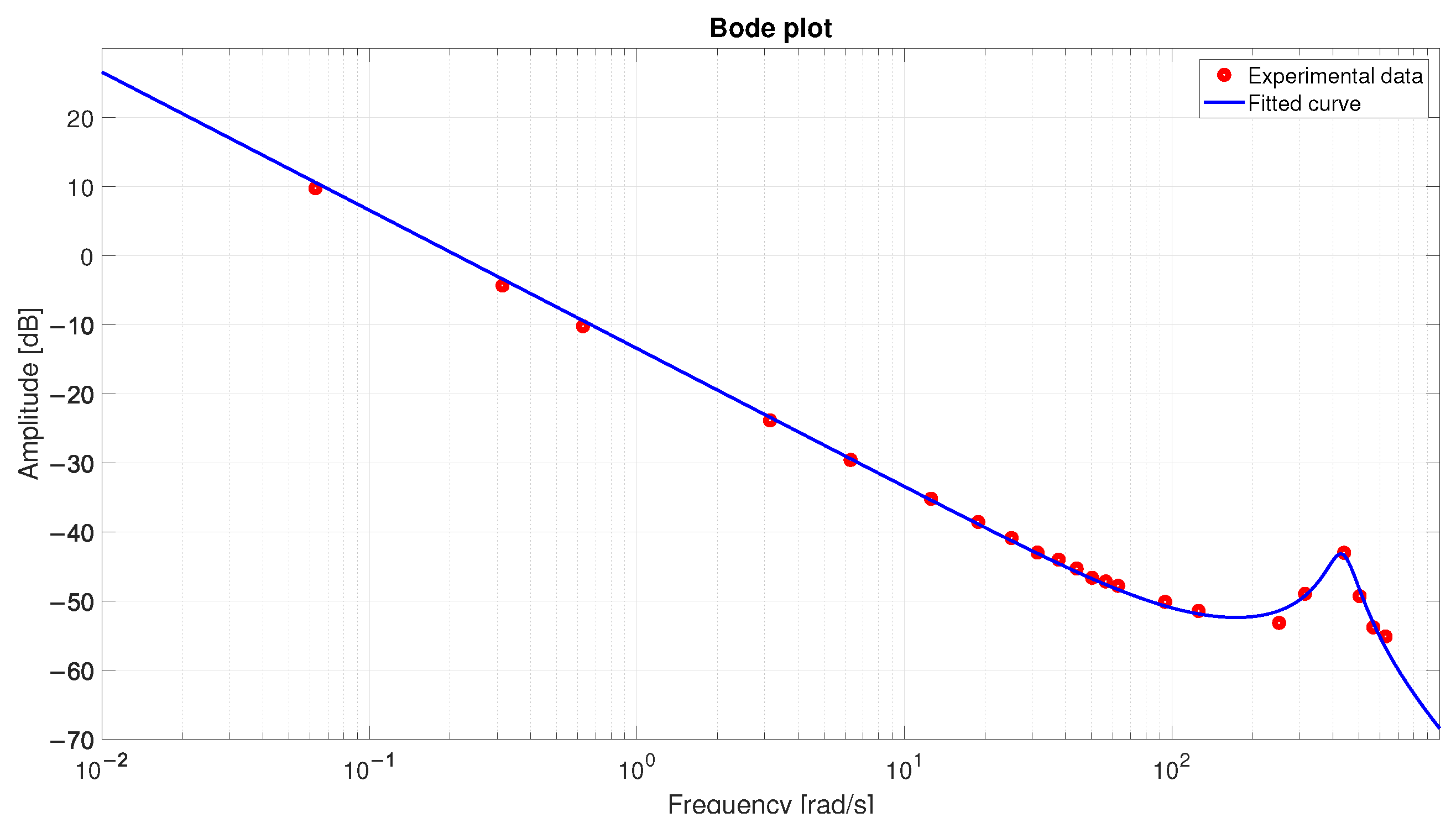 Figure 14 shows the curve fitted to the measured Bode plot of the transfer function’s modulus using the MATLAB R2023b curve fitting toolbox [
