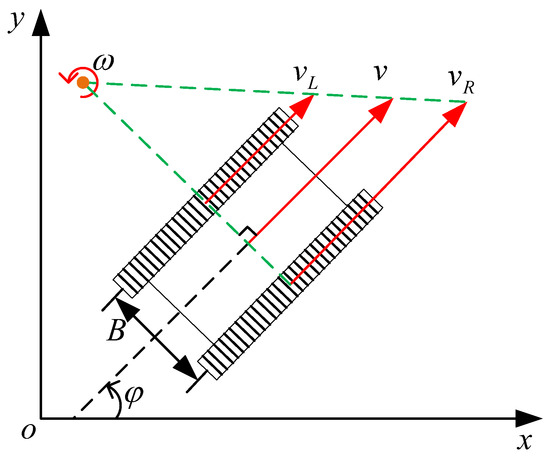 Generally, the control quantities based on the kinematic model are the linear velocity and the angular velocity of the vehicle body. In this paper, the control quantity of the robot is defined as the linear velocity of the left and right tracks and the virtual steering coefficient .