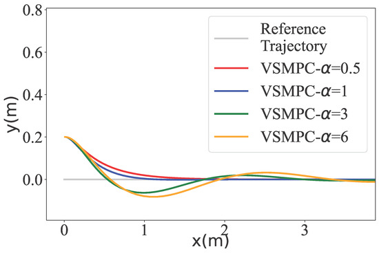 A straight-line path is selected as the reference path, with an initial position error of 0.2 m. We found that below 0.1, the algorithm responds very slowly to errors, while above 6, significant overshoot occurs in the trajectory. Therefore, we set the value range between 0.1 and 6. The trajectory tracking error is shown in Figure 4.