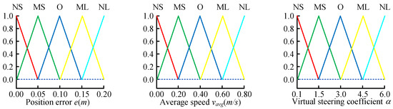 Input variable position error e, unit: meters; domain [0, 0.2]; fuzzy subsets designed as NS(Minimal), MS(Small), O(Medium), ML(Large), and NL(Extremely Large). The input variable is the average velocity vavg in the future prediction time domain, measured in m/s, with a domain of [0, 0.2]. The fuzzy subsets are NS(Minimal), MS(Small), O(Medium), ML(Large), and NL(Extremely Large). The output variable is the desired virtual steering ratio , with a domain of [0.1, 6] and fuzzy subsets NS(Minimal), MS(Small), O(Medium), ML(Large), and NL(Extremely Large). All three variables employ triangular membership functions, whose graphical representations are shown in Figure 5. Based on the rules above, the fuzzy rule table shown in Table 1 can be obtained.