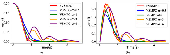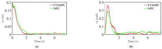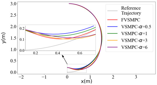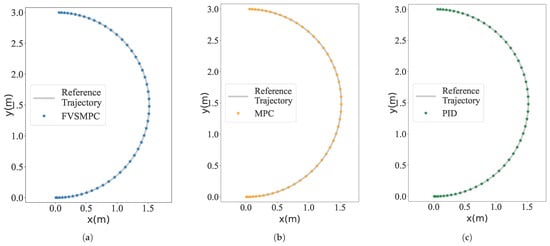 We established the robot’s kinematic model in Python 3.0 and implemented the control algorithm. The robot’s maximum speed in the simulation was set to 0.8 m/s, with a body width of 0.4 m. We configured a semicircular tracking trajectory with a radius of 1.5 m, featuring a time-varying control input that accelerates first, maintains constant speed, and then decelerates.We first compared our approach with an MPC algorithm featuring a fixed virtual steering matrix coefficient, followed by comparisons with traditional MPC and PID algorithms. Given that the performance of tracking controllers is highly dependent on parameter tuning, we carefully adjusted the FVSMPC, the penalty matrix of the MPC, and the proportional, integral, and derivative coefficients of the PID algorithm. Furthermore, we uniformly set the time domain T for the controller-based prediction to 20 and used the ECOS solver as the solution. We evaluated the error between the actual trajectory and the reference trajectory according to reference [30]. Specifically, position error is defined as the Euclidean distance between the actual position p(t) and the reference position .
