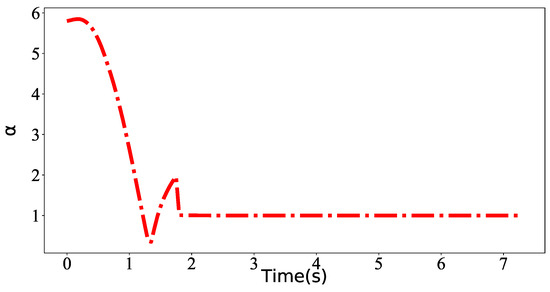 We configured four sets of model predictive controllers with fixed virtual steering coefficients of 0.5, 1, 3, and 6 for comparison with the fuzzy adaptive virtual steering model predictive controller proposed in this paper. Figure 6 shows the trajectory plots, demonstrating that all algorithms gradually converge to the reference trajectory, achieving successful trajectory tracking. Figure 7a illustrates the variation in position error, revealing the gradually converging error from 0.2 to 0. Figure 7b shows the angle error variation. The robot initially exhibited significant angular error in adjusting its head angle toward the reference trajectory. We repeated the experiment 10 times, averaging the results for each run. Table 2 lists the average position error, standard deviation, and convergence time for each algorithm. Figure 8 reveals that the virtual steering coefficient adjusted based on error and velocity conditions, initially decreasing from high to low values. As the robot approached the trajectory, the virtual steering coefficient gradually converged to 1.