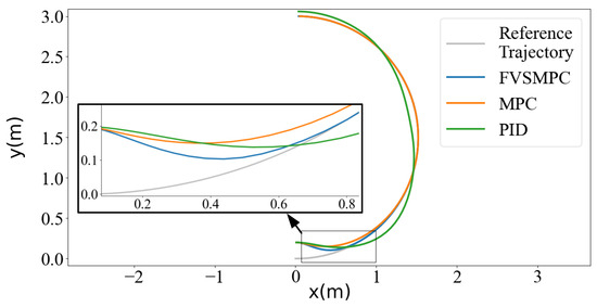 FVSMPC, MPC, and PID trajectory tracking comparison, in the case of a large initial error.