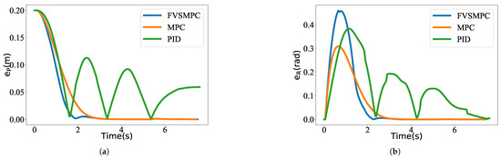Comparing FVSMPC with traditional MPC and PID algorithms, Figure 11 illustrates the temporal evolution of the position error and the angle error for the three control algorithms. The figure reveals the following. During the initial phase, the FVSMPC algorithm exhibits a rapid increase in angular error to achieve faster adaptation to the desired trajectory. The position error decreases rapidly in the initial stage and stabilizes approximately after 1.8 s, demonstrating fast convergence speed and a small steady-state error. The angular response of the MPC algorithm is slower than that of FVSMPC, stabilizing after about 2.7 s. The angular error response of the PID algorithm is between that of FVSMPC and MPC. Its position error decreases rapidly initially, but exhibits significant oscillations with large amplitude after approximately 2 s, failing to converge. Table 4 shows the average position error, standard deviation, and convergence time, where the FVSMPC algorithm outperforms the baseline MPC and PID algorithms.