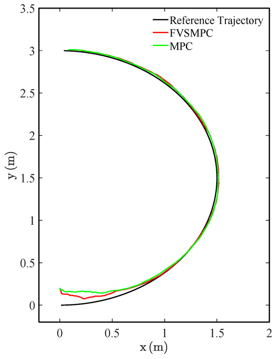 Using the same semicircular trajectory with a 1.5 m radius as in the simulation setup, the speed profile involves initial acceleration, followed by constant velocity, and concludes with deceleration. We implemented the FVSMPC algorithm on the robot and compared it with the standard MPC algorithm. Figure 12 displays the actual test trajectory plots: black represents the reference trajectory, red shows the position results of the FVSMPC algorithm, and green indicates the position results of the standard MPC algorithm. Figure 13a illustrates the variation in the robot position error, while Figure 13b depicts the variation in the robot angle error. The curve trends align with the simulation results. We repeated the experiment 10 times, averaging the results for each run. The average position error of the proposed algorithm is 0.0298, while the conventional MPC achieved an average position error of 0.0317, representing a reduction of 5.99%.