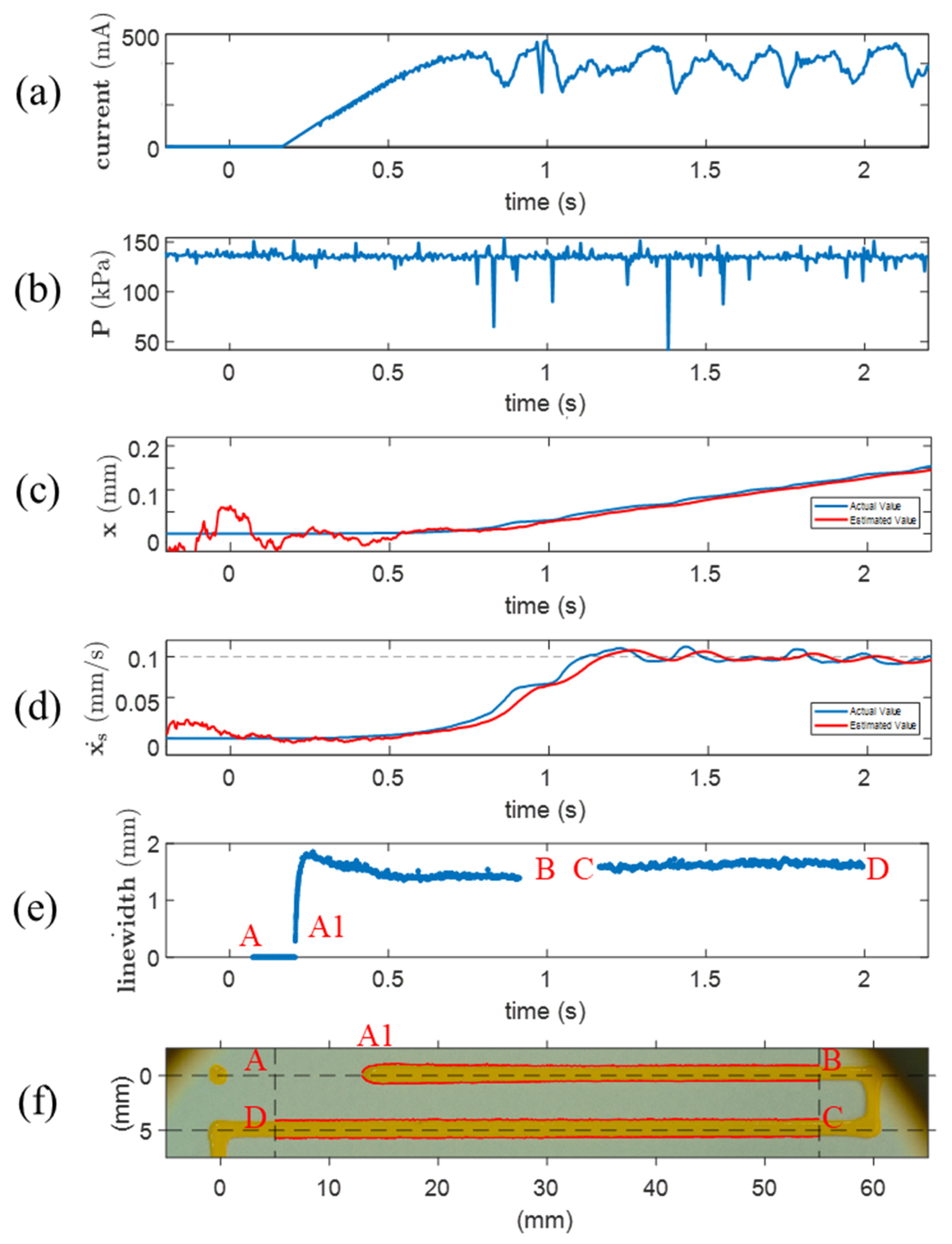 - Closed-Loop Volumetric Flow Regulation: A proportional–integral–derivative (PID) controller is applied to the estimated flow rate to regulate extrusion output. This approach enables real-time compensation for variations in material viscosity, actuation lag, and dynamic disturbances, enhancing extrusion stability and consistency.