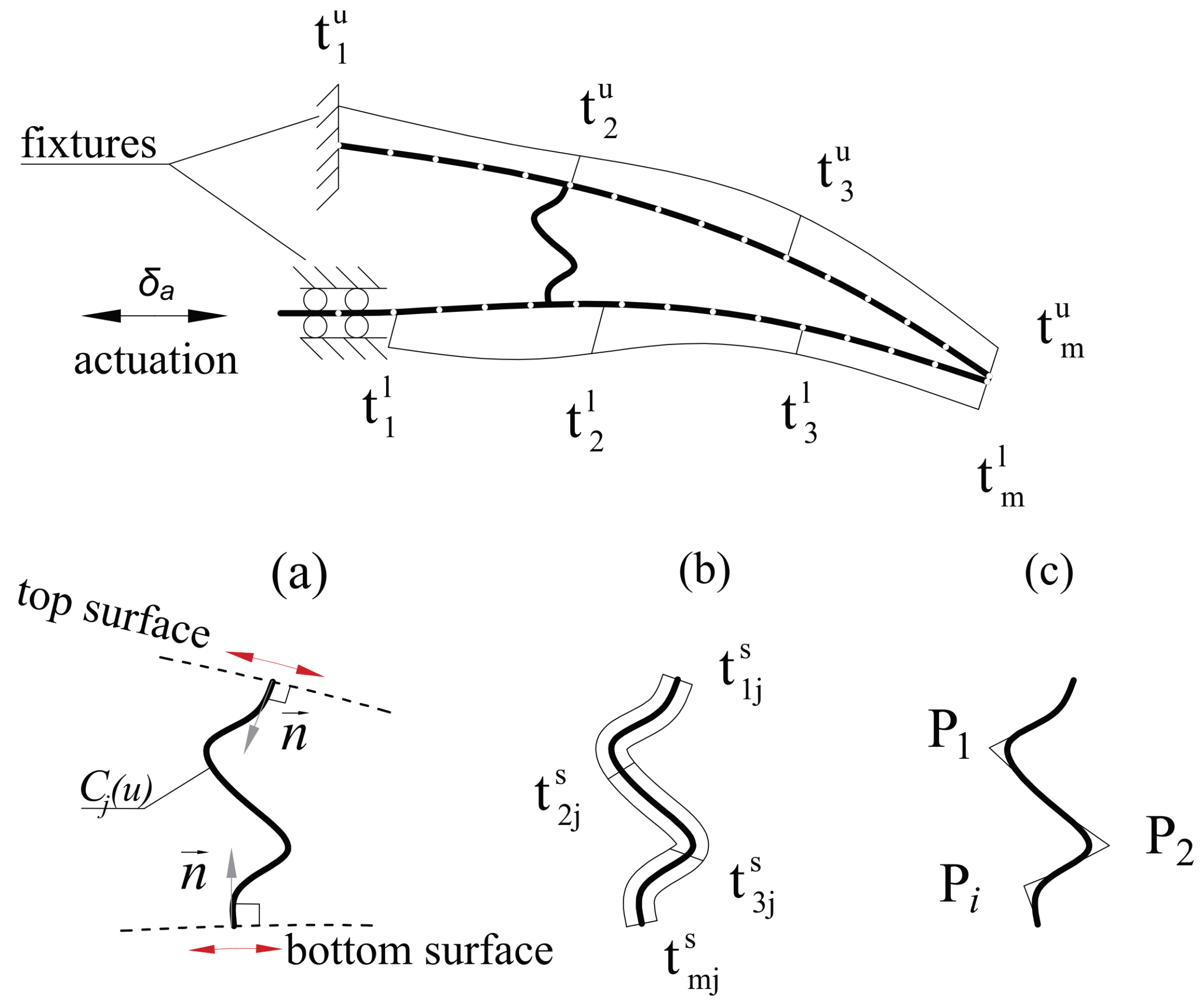 Figure 1. These designs feature continuous top and bottom trailing-edge surfaces connected by thin transverse straight or curved elements. These transverse elements provide additional stiffness to the outer skin, enabling supporting compliance and assisting outer surfaces during morphing. Such patterns are also observed in other compliant trailing-edge structures [