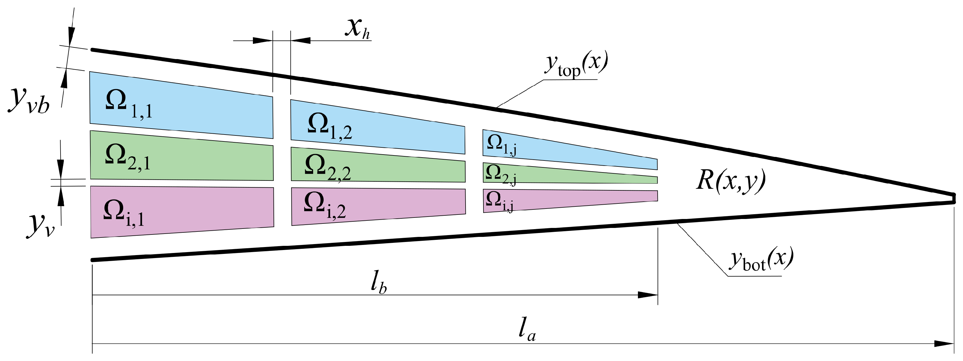 where the columns are vertical divisions, and the rows are horizontal divisions. Graphically, the regions can be arranged within the design space of the trailing edge, as illustrated in