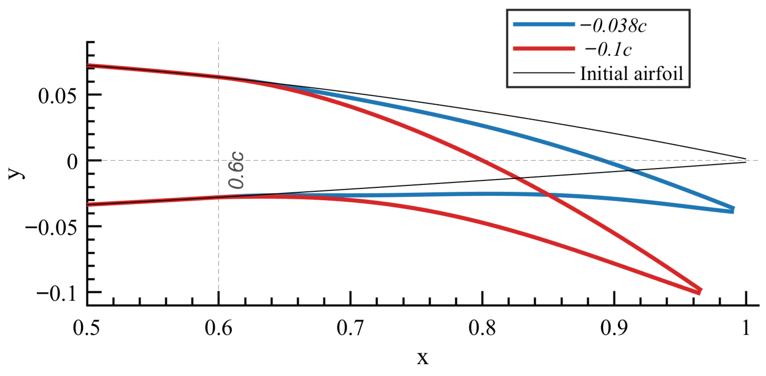 The upper trailing-edge surface remains continuous and fixed to the wing’s main structure, whereas the lower surface at the actuation point is supported by a slider constraint. This constraint restricts motion perpendicular to the chord and prevents rotation but allows translation along the chord. In this formulation, trailing-edge morphing is initiated by applying a displacement constraint at the control rod position. This displacement acts as a design variable and one of the optimization parameters. Displacement, rather than force, is used to drive the trailing-edge morphing during optimization because displacement bounds are easier to control. By appropriately selecting these bounds, structural shape deformations can be effectively limited in unfeasible directions.