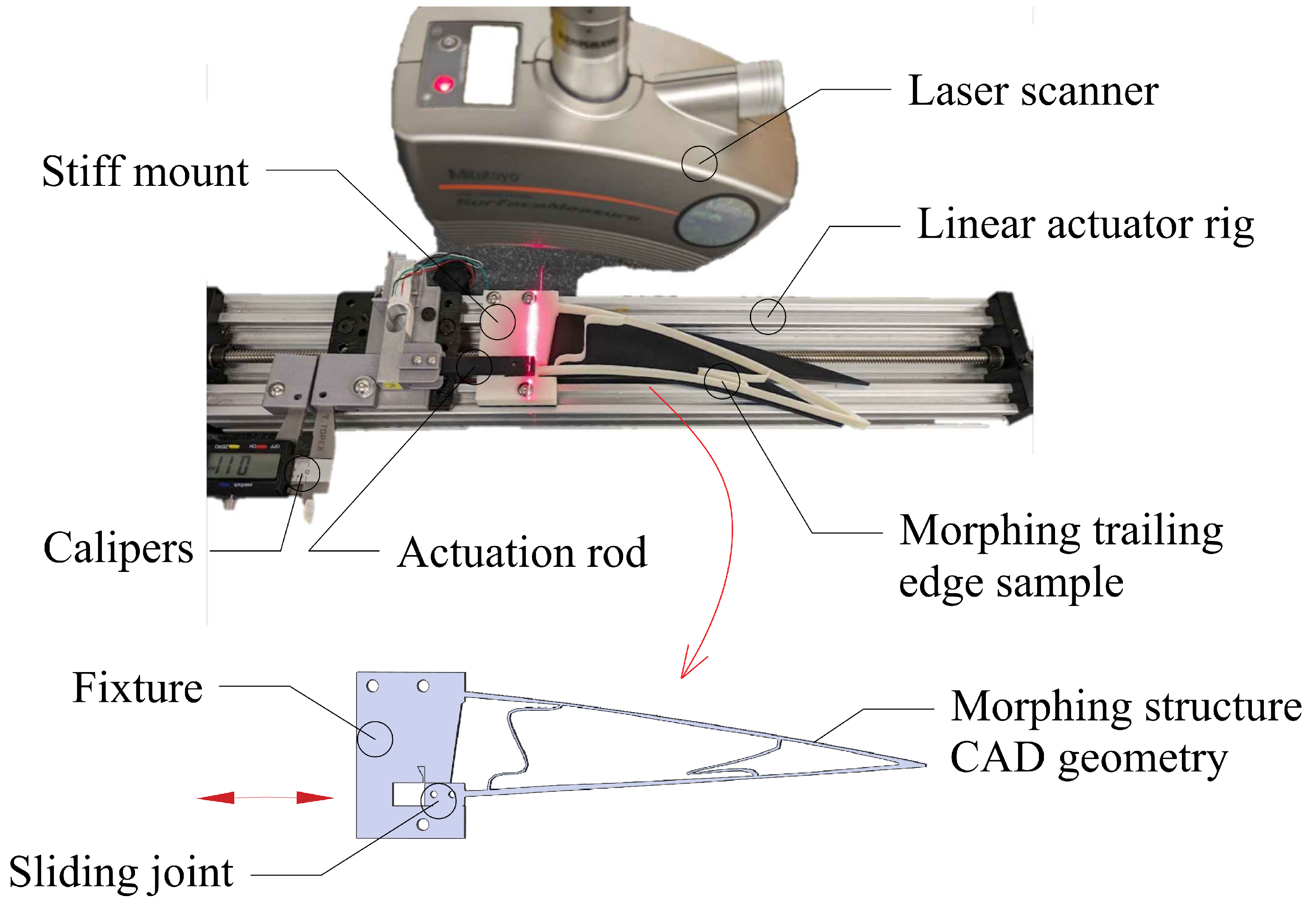 The manufactured wing samples are then mounted on a linear actuation rig, which allows precise motion control via a lead screw. For preliminary actuation, electronic calipers are attached and used for initial placement. Measurements are performed on a Mitutoyo coordinate measuring machine equipped with a touch probe and a laser scanner. The measurement precision of the equipment is specified as MPE = (1.7 + 0.3L/100) µm, where L denotes the measured length in millimeters. The main non-touch surface measurements are performed with an Mitutoyo SM 606 laser scanner, which has a scanning error of 12 µm. The complete experimental setup is shown in
