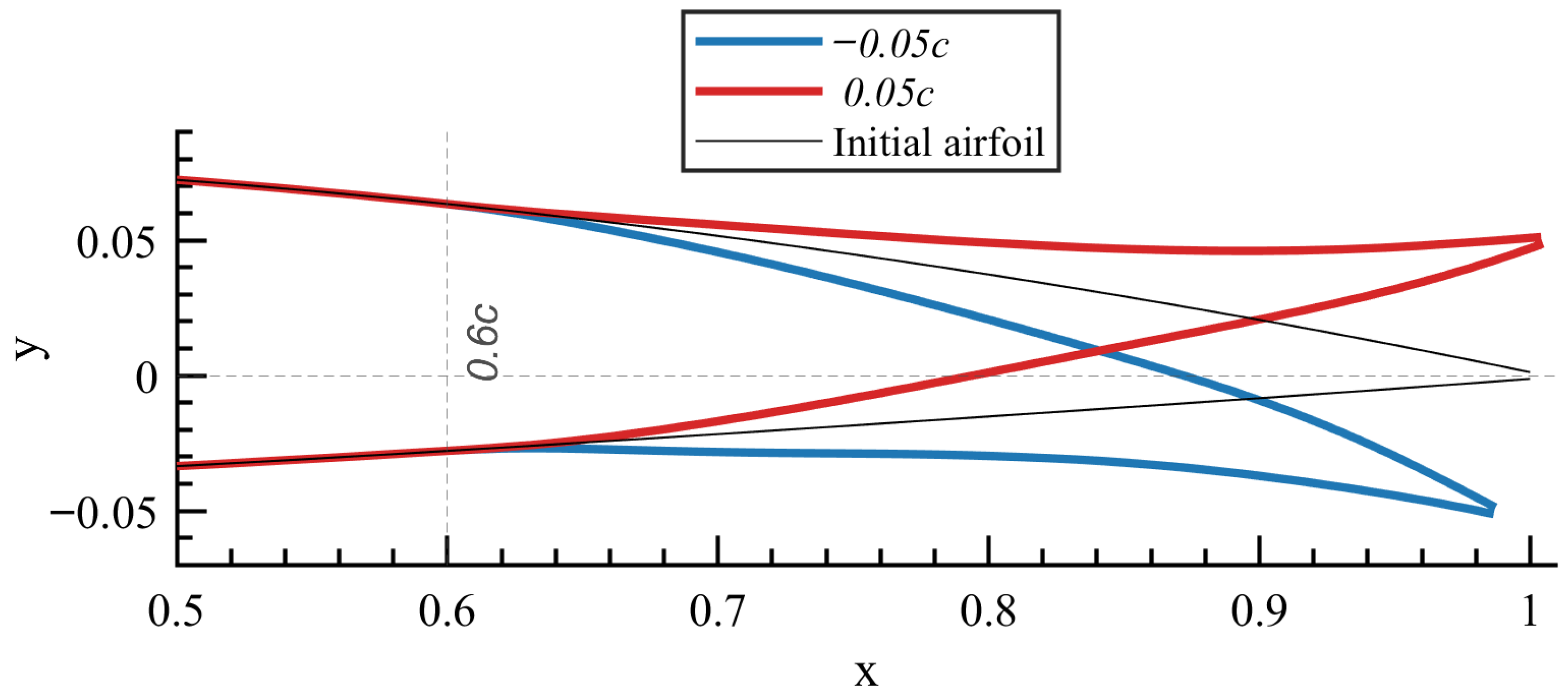 c denotes the wing chord. For aerodynamic evaluation during optimization, XFOIL Version 6.99 is configured with standard settings, using an Ncrit value of 9 and 200 panels. The first aerodynamic optimization case is aimed to maximize the lift-to-drag ratio in the section lift coefficient