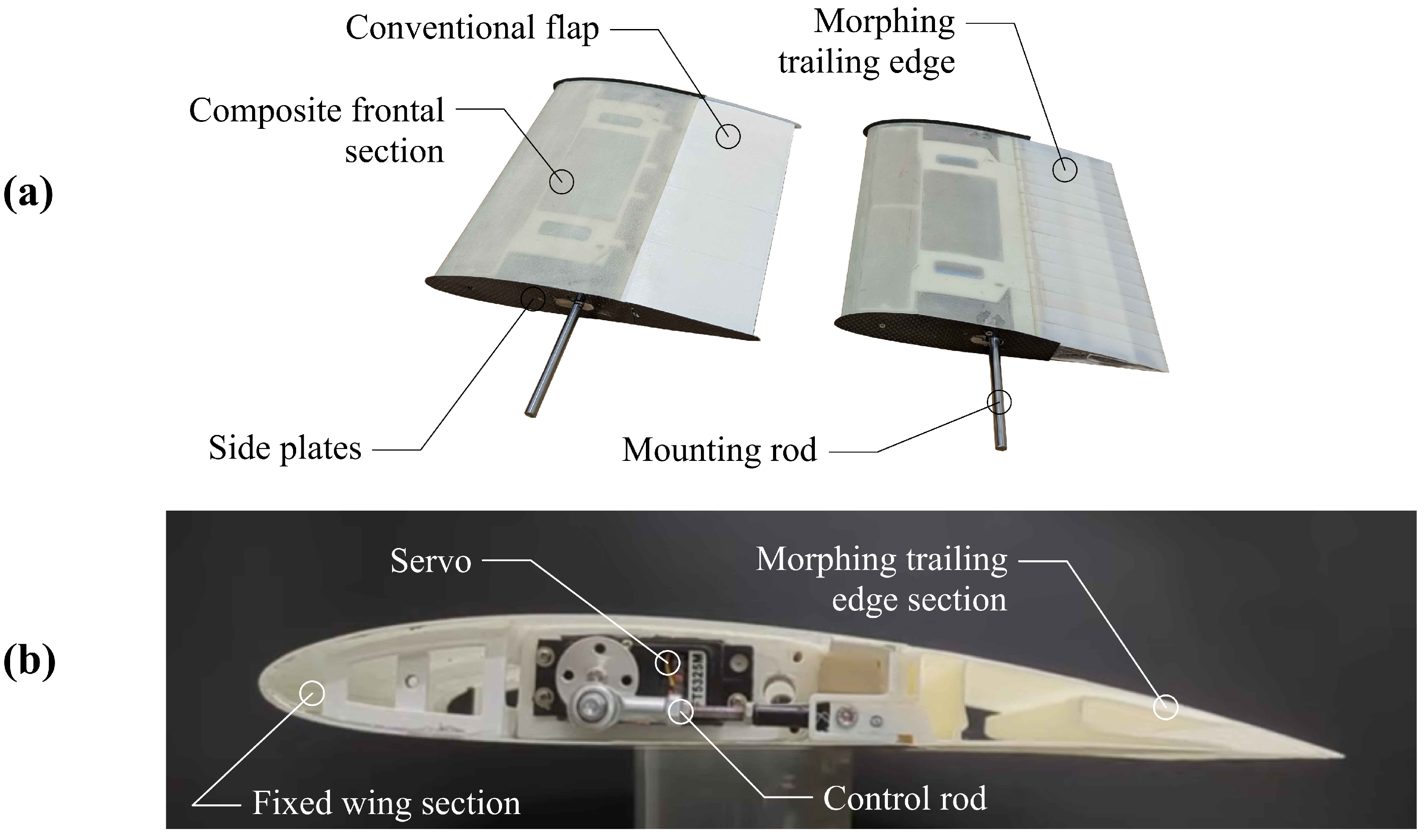 Figure 13a). The wing equipped with a conventional flap serves as a benchmark to validate and compare the performance of the morphing trailing edge. The conventional flap is defined as a plain flap with its rotation axis located at the same position,