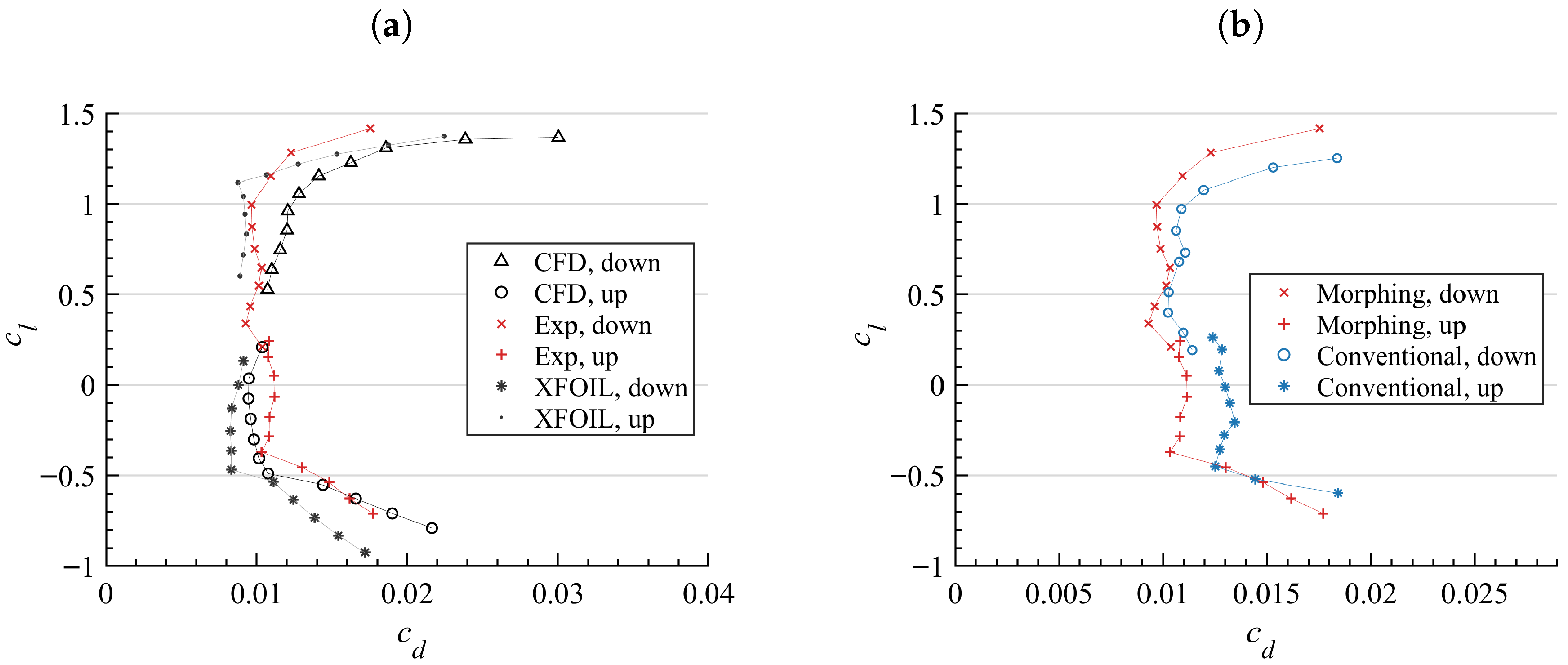 Figure 15a). Some discrepancies are observed between the two computational methods and the experimental results. For the downward-deflected trailing edge, the experimental data lay between the XFOIL and CFD predictions. In this case, the SST Transition model likely does not capture flow transition accurately and overestimates drag, resulting in the XFOIL prediction being closer to the experimental results. For the upward-deflected case, the experimental results show higher drag and slightly greater lift compared with both computational methods. Notably, in the actuated morphing trailing-edge configurations, the overall drag polar shape aligns more closely with the XFOIL prediction, despite its usual tendency to overestimate drag. Additional variations may arise from the wind tunnel setup and the morphing geometry itself. Some of the deviations could also be attributed to shape inaccuracies introduced by the optimization algorithm, as seen in