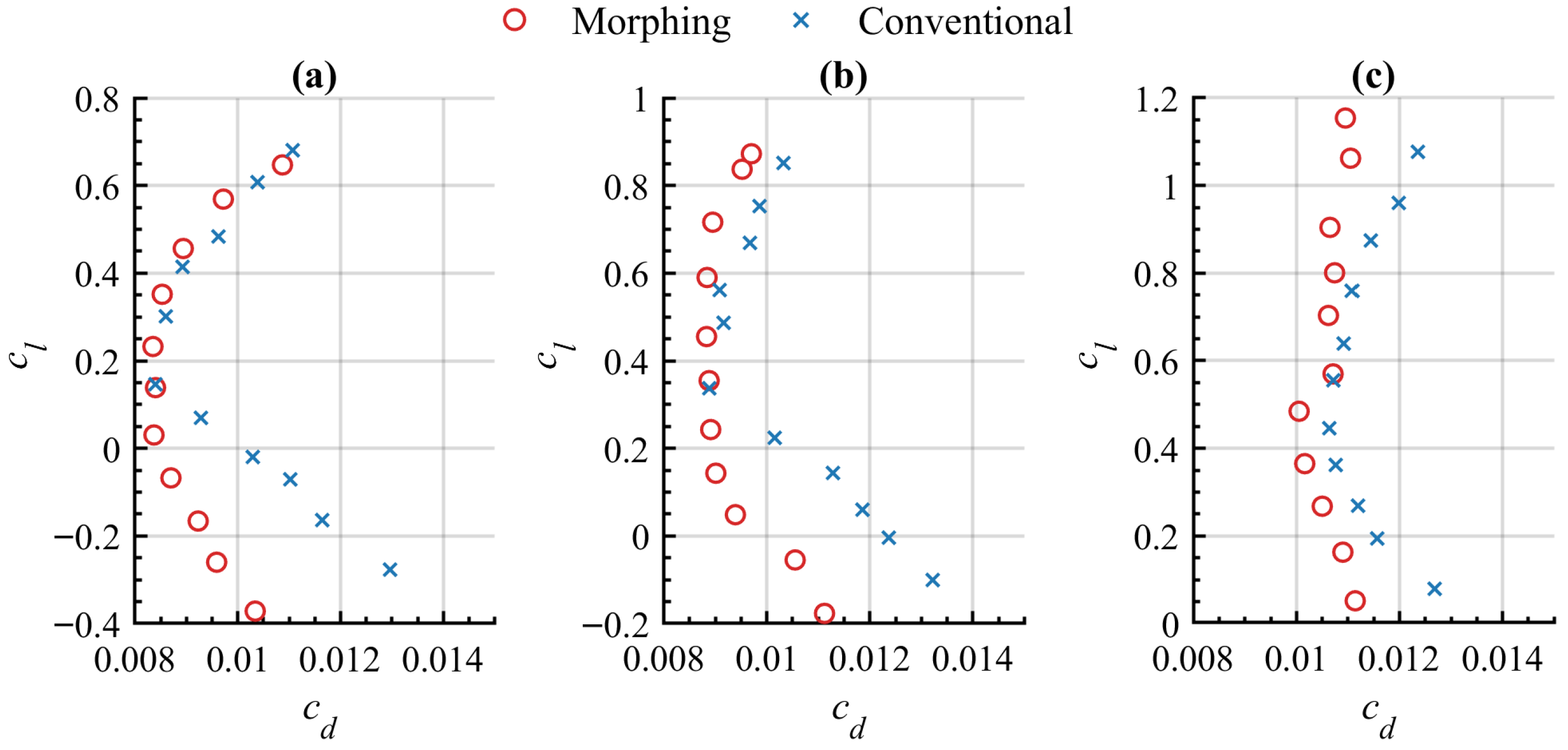 For the upward-deflected () morphing trailing edge, which is optimized for minimum drag, the mean over the intended angle of attack range is 0.0109, representing a reduction of 16.8% compared to the conventional flap. This drag reduction results in a substantial improvement in aerodynamic efficiency under upward deflection, with the mean increasing from to .