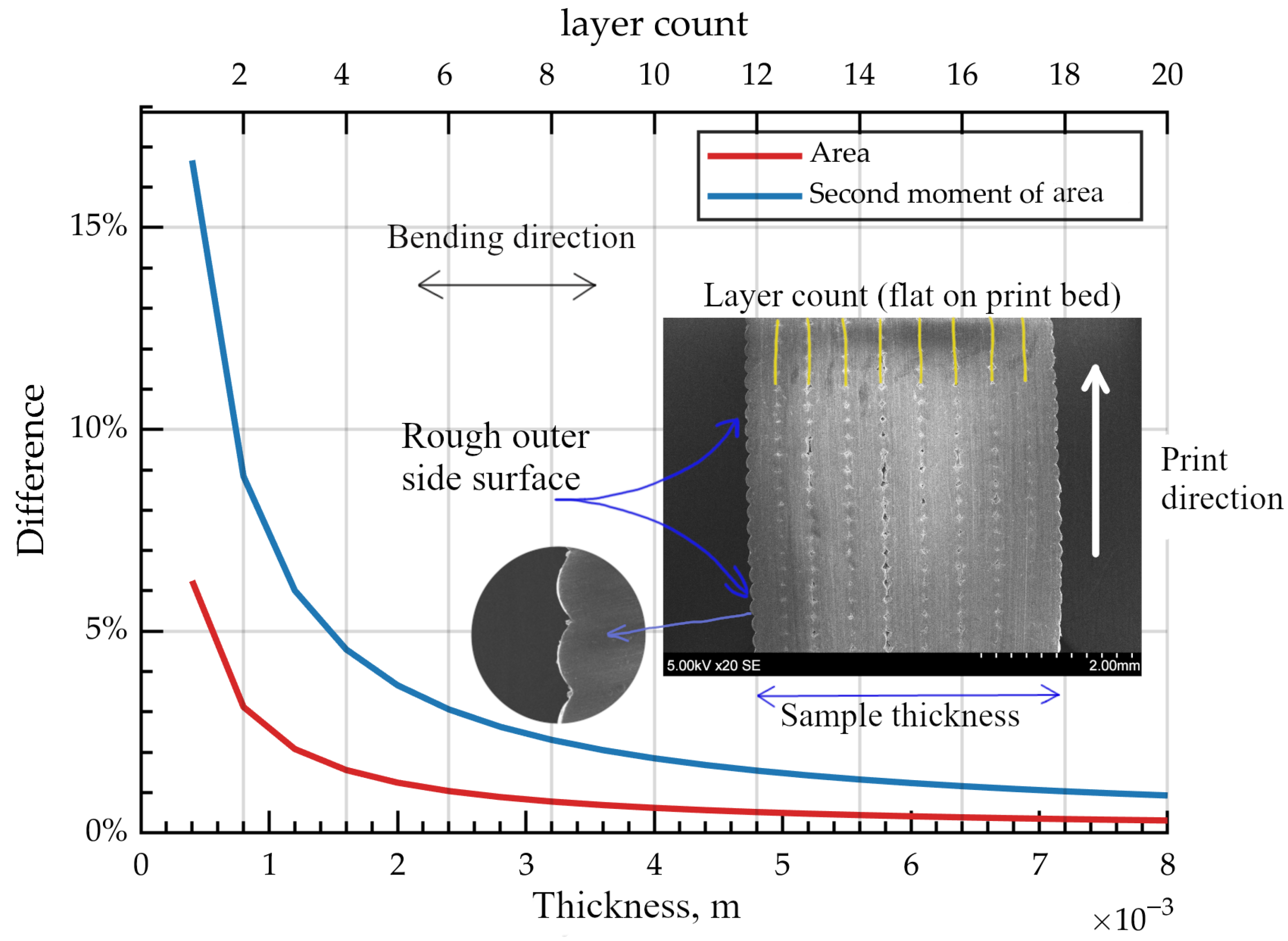 Figure 17 compares section properties between the rectangle and the approximated modeled section geometry as the printed layer count increases towards a thicker beam. The same figure also includes an SEM photo of a multilayer, vertically printed 3D sample. The results show that when the number of layers is small, surface geometry plays a significant role in bending stiffness. Most differences arise from textured surfaces and bulged circular cross-section areas. As the thickness decreases, the textured surface shifts closer to the neutral line of the beam, reducing the amount of material near the edges. In the present morphing trailing edge example, the layer count ranged from 2 to 10, indicating a substantial effect for the outcome.