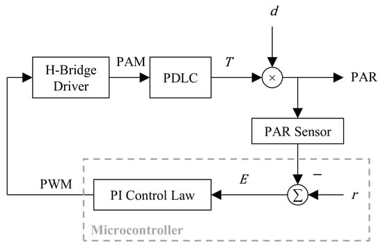 The core feedback control scheme utilizes a PI control law implemented on a microcontroller (Arduino Due) to regulate PAR levels measured by a custom sensor, consistent with the approach in []. Figure 1 shows the control block diagram, illustrating the signal flow between the sensor, controller, driver, and PDLC film. The error, E, between the desired PAR setpoint, r, and the measured PAR signal is used to calculate a Pulse Width Modulation (PWM) control signal. This PWM signal dictates the operation of an H-bridge driver, which generates the necessary AC Pulse Amplitude Modulation (PAM) voltage to control the transmittance, T, of the PDLC film. The measured PAR is the product of the incident light, the disturbance, d, and the PDLC transmittance. The PI control law aims to minimize the error, thereby maintaining the desired PAR level despite variations in the disturbance.