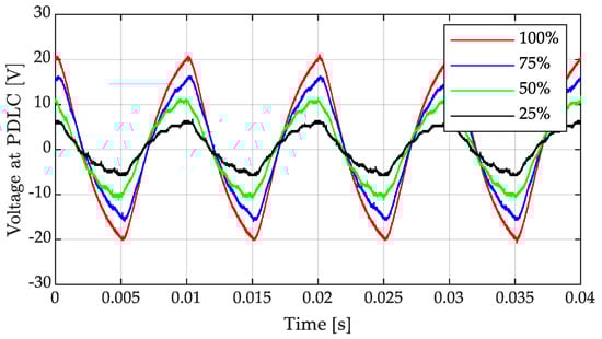 The value of was specifically selected through testing to optimize the PAM waveform shape, waveform examples at different duty cycles are illustrated in Figure 5 and minimize ripple across the PDLC when driven by the PWM signal. Figure 5 shows the experimental PAM throughput voltage results. PWM is at 1 kHz for a 100 Hz PAM square wave to driver resulting in an approximate sine wave across PDLC load.