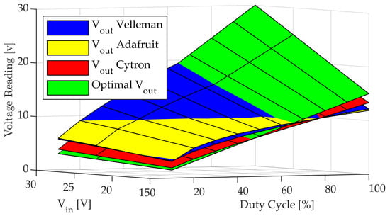 A key hardware update was the selection of the H-bridge driver. Three drivers were evaluated in this study. Their voltage output characteristics are compared in Figure 6, with the Cytron MD10C R3 being chosen for the final experiments due to its superior performance in delivering the desired voltage amplitude compared to the Velleman KA03 used previously []. The supply voltage was set to 30 V.
