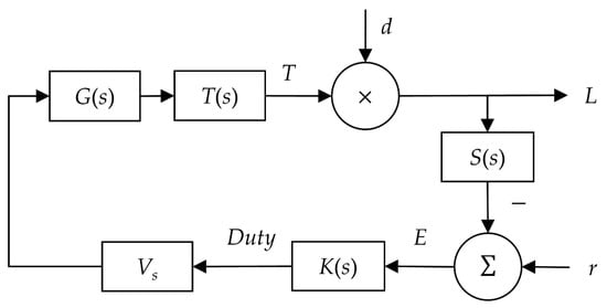 The structure of the control-oriented model, conceptually shown in Figure 7, remains the same as presented previously [], separating the PDLC response into a dynamic part, G(s), and a static transmittance part, T(s). The identification of these functions was refined based on data collected with the final experimental setup. Note that S(s) represents the PAR sensor, which is defined in Section 2.2.2.