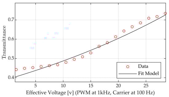 Quasistatic transmittance was measured by stepping the PAM voltage from 0 to 30 V. Figure 9 displays the derived transmittance data points plotted against equivalent voltage and the fitted exponential model. The relationship between equivalent PAM voltage and transmittance was modeled using an exponential function:
