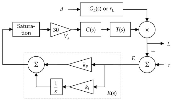 Simulations of the PDLC control system were performed using MATLAB (R2024a) Simulink (ode45 solver). Block diagrams illustrating the simulation structure for both laboratory and in situ conditions are provided in Figure 10. The simulation incorporated the PI controller, supply voltage scaling (), the dynamic model , and the static transmittance model .