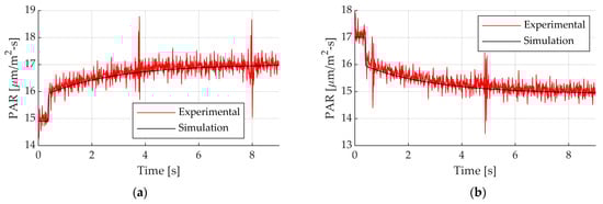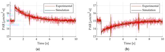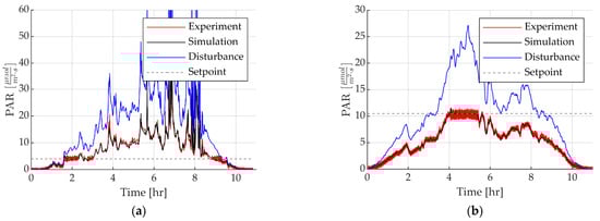 Simulation of in situ experiment conducted: (a) on a partly cloudy day with a setpoint of 4 PAR, recorded on 12 January 2025; (b) on an overcast day with a setpoint of 10.5 PAR, recorded on 11 February 2025.