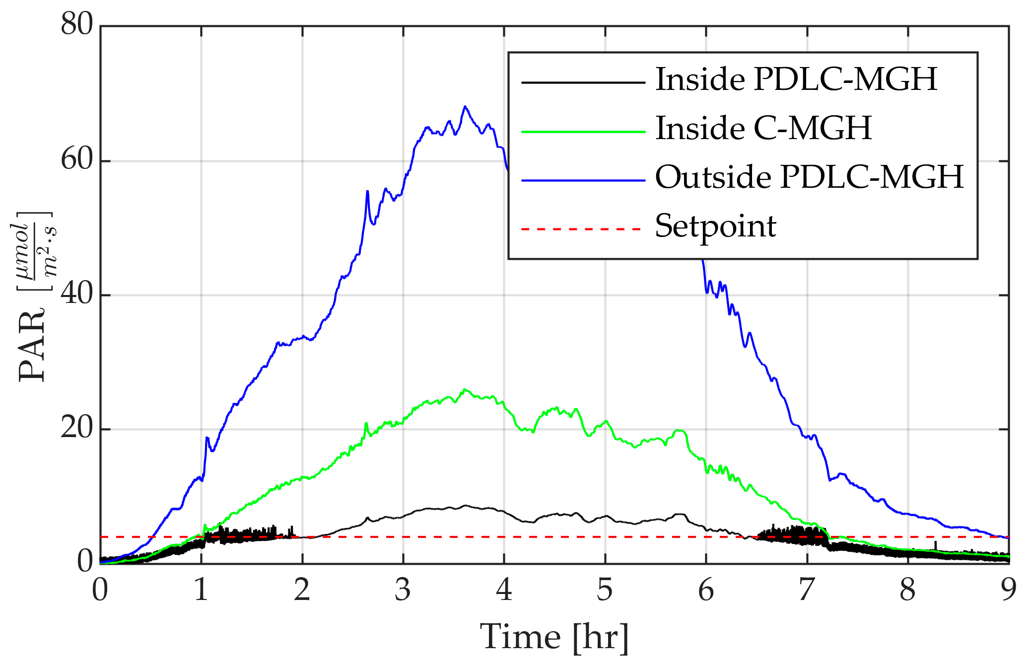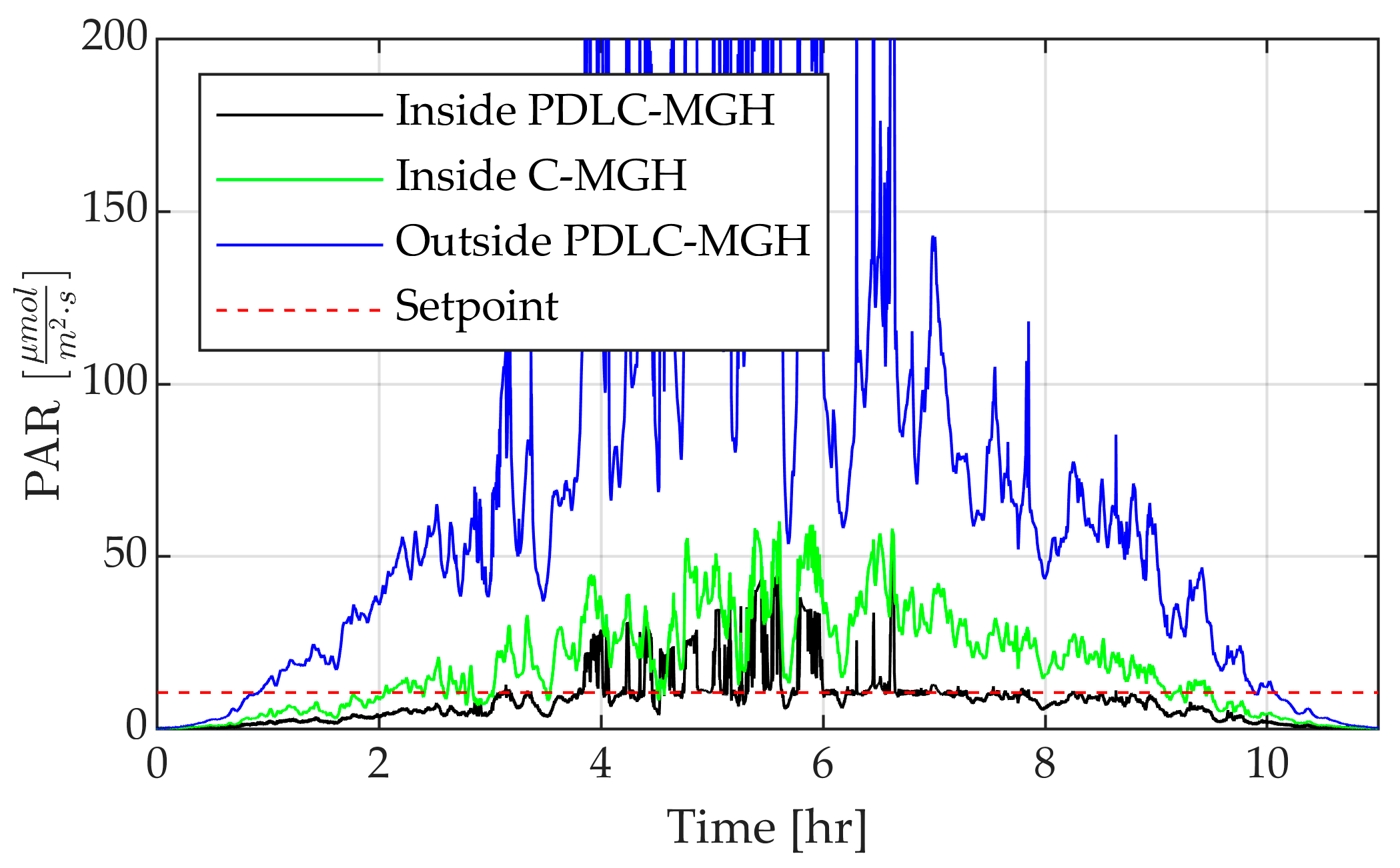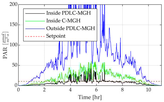 For in situ tests, PAR sensors were placed inside the PDLC-MGH, inside the C-MGH, and outside (on top) of the MGHs to measure incident light.