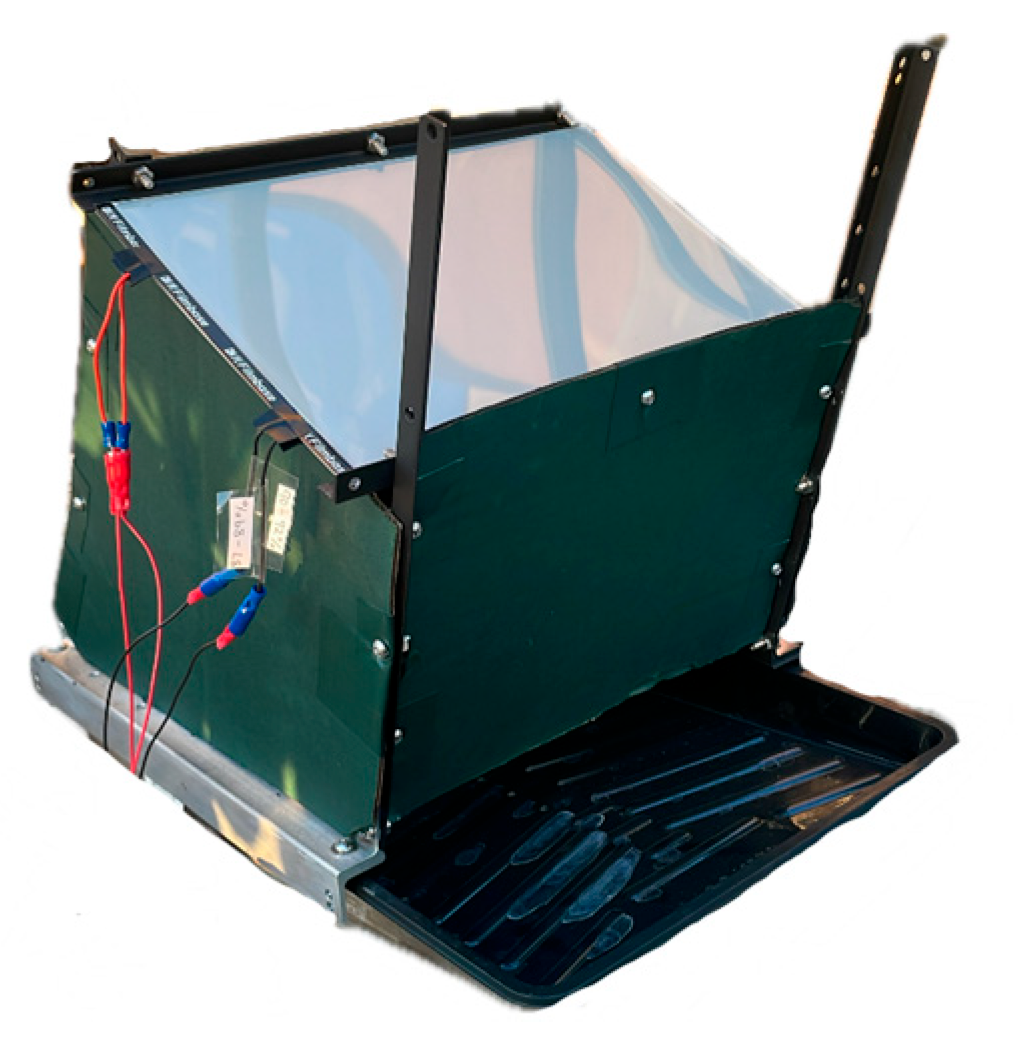 11], where the tests were conducted. The frame was painted black, and matte green cardboard walls were attached to minimize internal reflections. A water tray formed the base, holding the PAR sensor. For in situ tests, this PDLC-MGH was placed inside a larger greenhouse structure.
