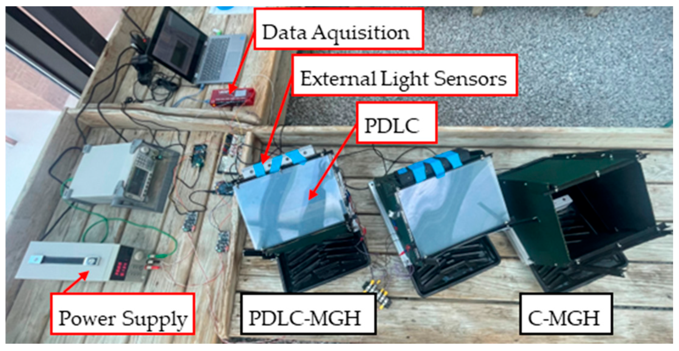 Figure 3 shows the arrangement of the MGHs and data logging equipment during the in situ tests. A second, identical MGH structure without PDLC films the Control MGH (C-MGH), was placed nearby for comparative light measurements. The third MGH was used for a different experiment and will not be further mentioned.