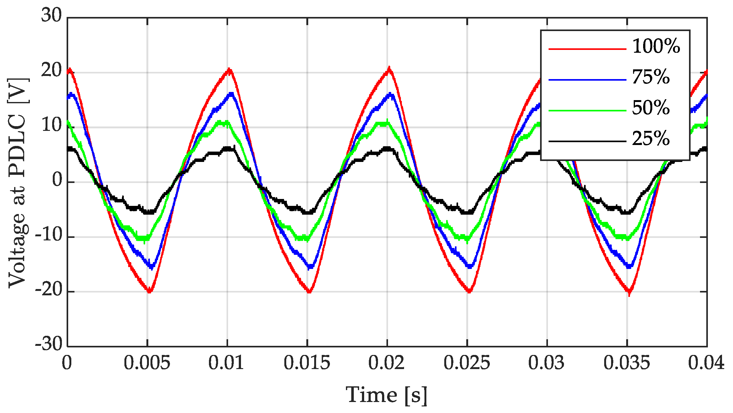 Figure 5 shows the experimental PAM throughput voltage results. PWM is at 1 kHz for a 100 Hz PAM square wave to driver resulting in an approximate sine wave across PDLC load.
