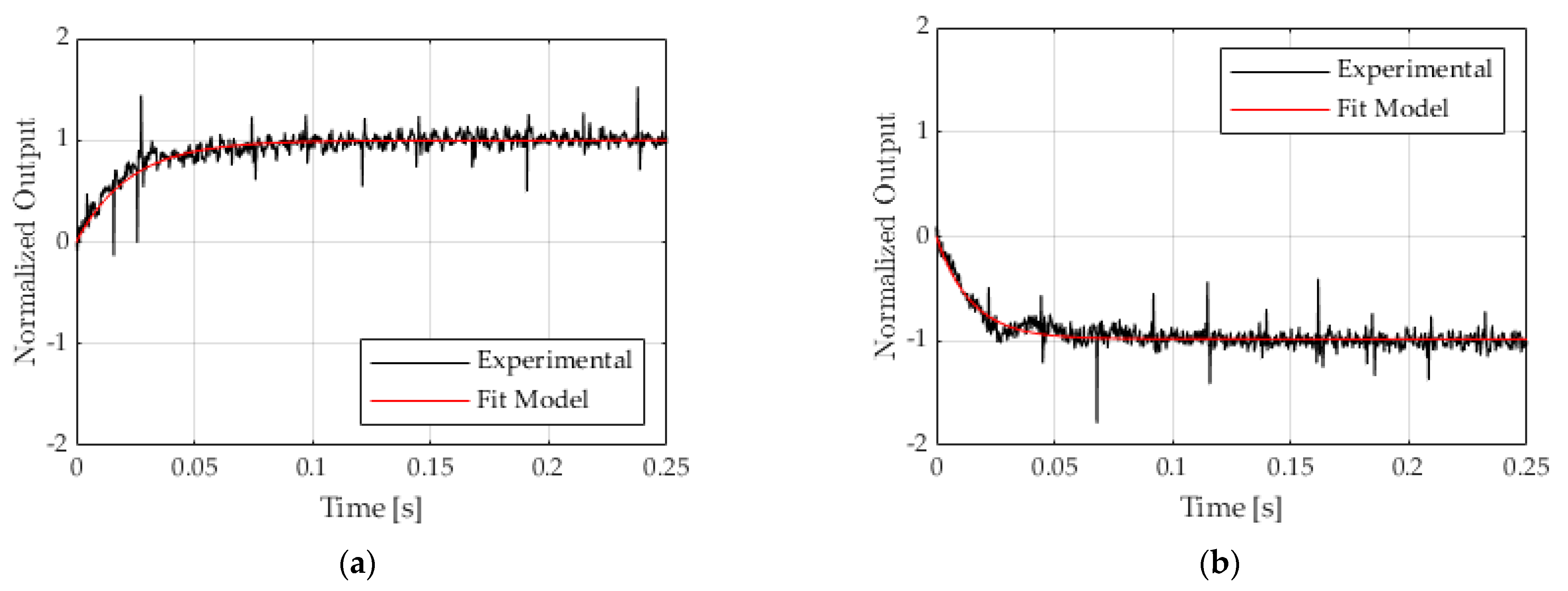 Figure 8 shows the normalized experimental step response data for step-up and step-down inputs, along with the first-order simulation fit. The data is fitted to a first-order transfer function: