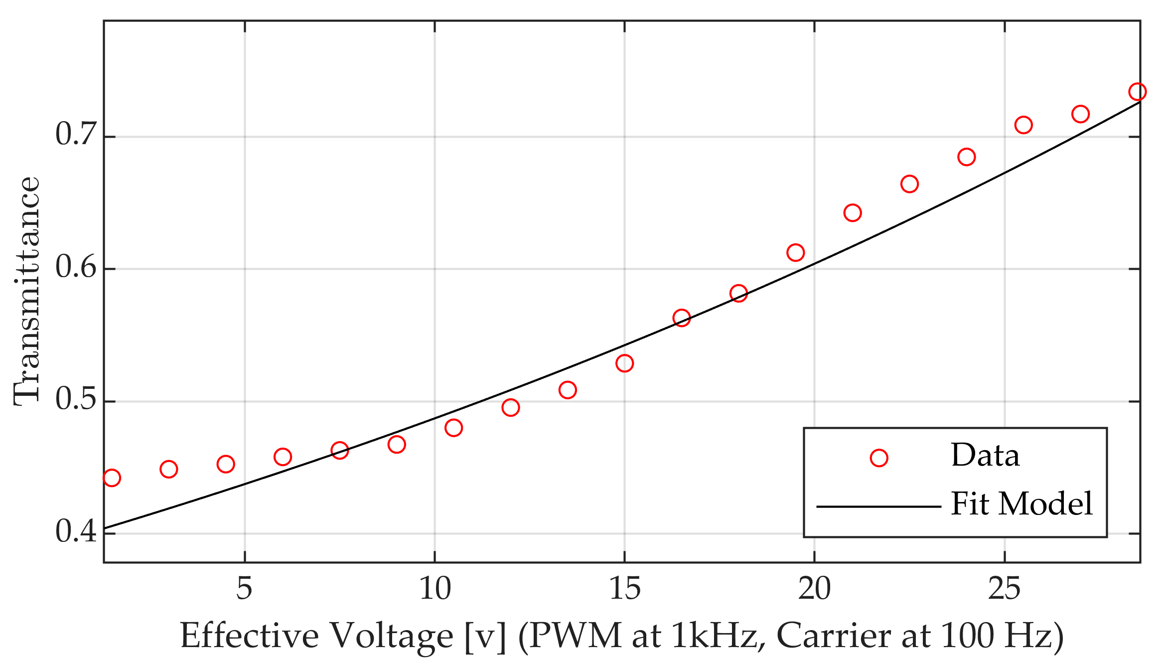 Figure 9 displays the derived transmittance data points plotted against equivalent voltage and the fitted exponential model. The relationship between equivalent PAM voltage and transmittance was modeled using an exponential function: