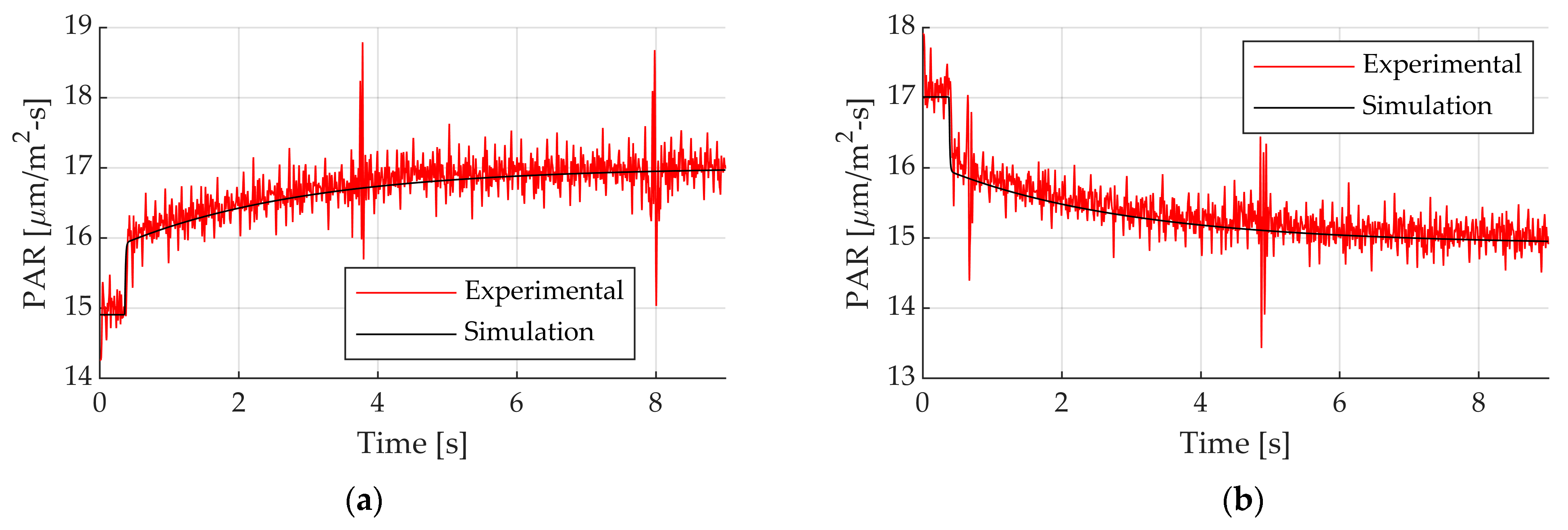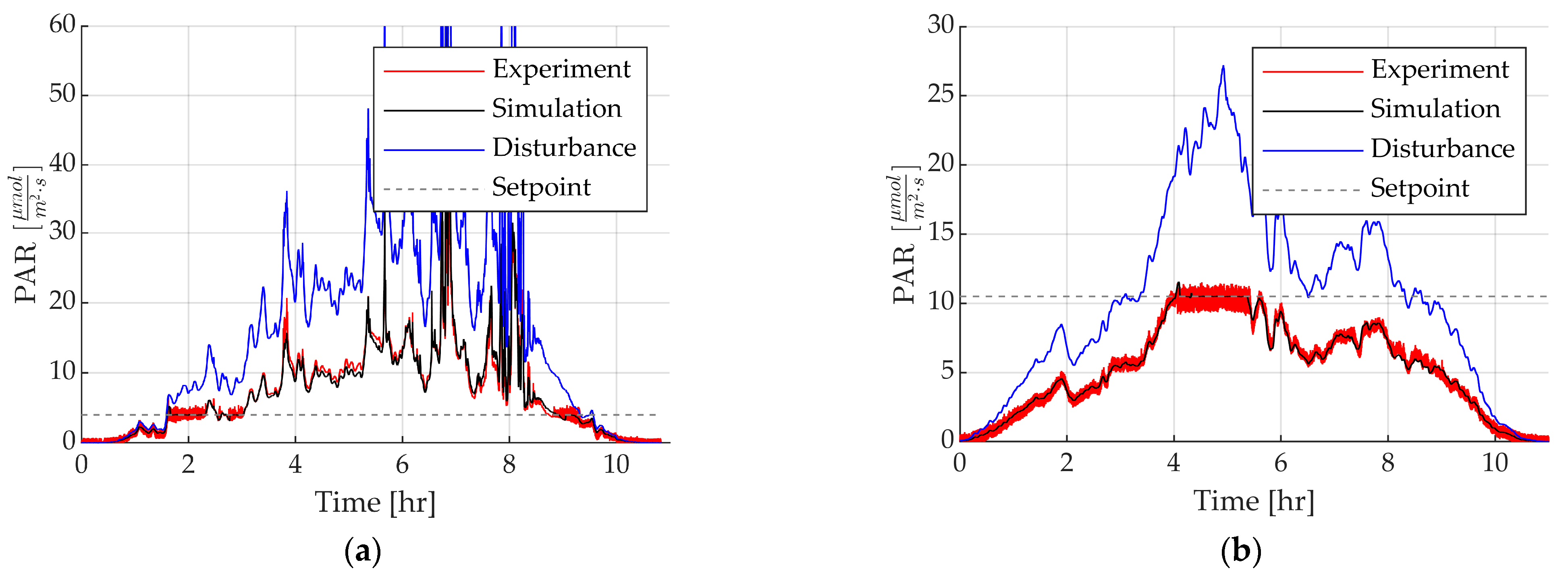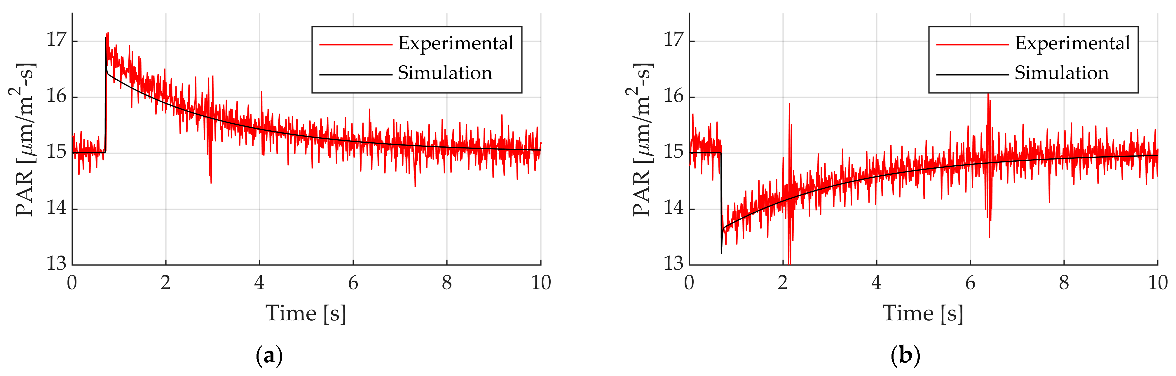 Figure 15a,b present the simulation results overlaid with experimental data for the 4 PAR and 10.5 PAR setpoint tests, respectively. The simulation accurately captured key aspects of the system’s behavior, including periods of regulation, saturation limits, and responses to fluctuating incident light, thereby confirming the robustness and predictive capability of the model.