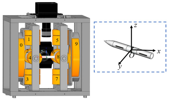 The MSBS comprises electromagnetic coils, a connecting frame, a controller, a position sensor system, and a model with embedded cylindrical magnets. The system structure is illustrated in Figure 1. The coil system consists of eight electromagnets (#1 to #8) and two solenoids (#0 and #9), arranged in a point-symmetrical distribution centered at the origin of the test section [18]. A right-handed Cartesian coordinate system is fixed relative to the wind tunnel. The origin of this coordinate system is defined at the reference center (typically the center of mass of the test model) [22]. The positive x-axis is aligned with the freestream flow direction, the y-axis lies in the horizontal plane perpendicular to the x-axis, and the z-axis completes the right-handed system by pointing vertically upward.