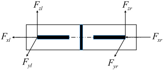 Schematic of force acting on the suspension model (where , , are the external forces on the front/left end. , , and are the external forces on the rear/right end of the model).