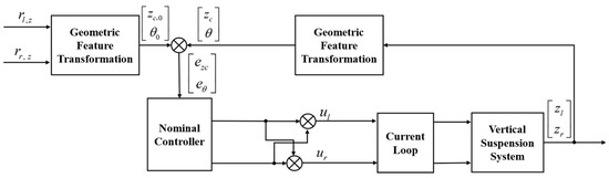 To reduce sensitivity to model dependence, nonlinearities, and modeling errors, this article proposes a decoupling control method based on geometric feature transformation, building upon feedback decoupling control. Considering that the key geometric state variables of the vertical suspension system include vertical displacement, center-of-mass position, and pitch attitude angle, the core idea of this method is to transform the vertical displacements at the front and rear of the model into the center-of-mass position and pitch angle of suspension model via geometric relationships. The control law is then designed based on these transformed geometric state variables. The schematic diagram of the principle is shown in Figure 4.