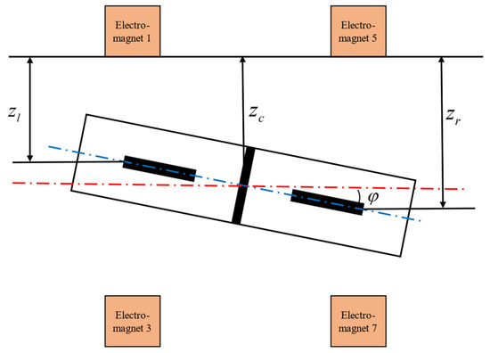 Assuming the distance between the outer surface of the core of electromagnet 1 and the x-axis of the absolute coordinate system is , it can be obtained that , , and . Therefore, the total electromagnetic force acting on the front end of the model along the vertical direction, , is: