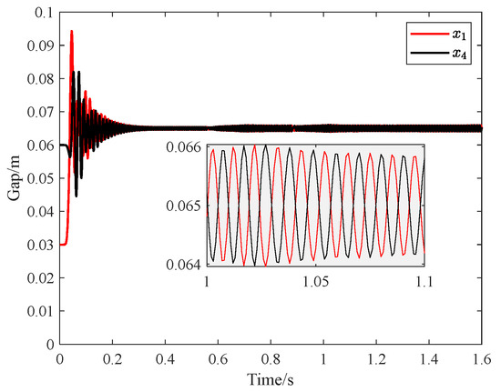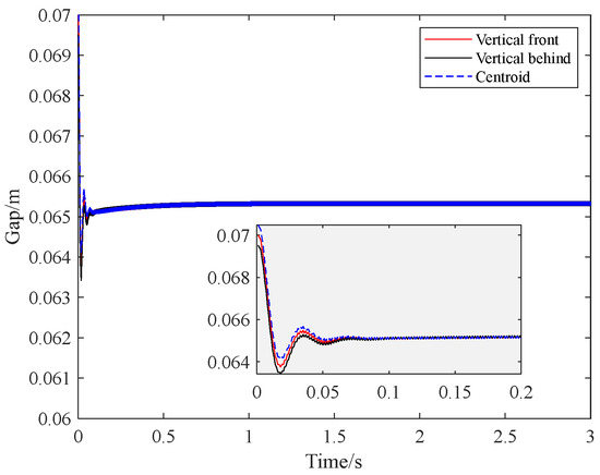 The PID controller parameters are set as , , , . Figure 6 shows the curves of the front vertical position and rear vertical position of the magnetically suspension model without decoupling. Both the front and rear ends exhibit oscillations with an amplitude of approximately 0.002 m. A magnified view clearly reveals that the displacement curves at both ends exhibit nearly sinusoidal fluctuations with a period of about 0.005 s (corresponding to a frequency of 200 Hz) and a phase difference of 180°. This further confirms the presence of significant dynamic coupling between the front and rear vertical degrees of freedom in the MSBS. When independent control is applied to the electromagnets at both ends, the front and rear ends show periodic vibrations with equal amplitude and opposite phase (180° phase difference), indicating that the vertical suspension system exhibits a typical pitch vibration mode without decoupling. This mode oscillates persistently at a natural frequency of about 200 Hz, causing disturbances on one side to trigger cooperative oscillations on both sides. This phenomenon profoundly reveals the strong coupling between the mechanical structural dynamics and the control loops. Therefore, a decoupling controller must be designed to suppress this inherent vibrational mode and improve the stability of the vertical suspension system.