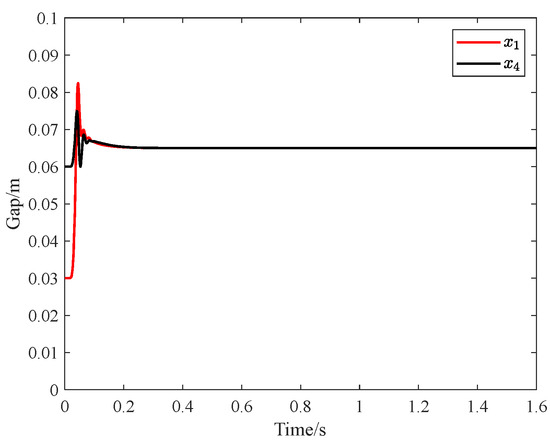 , , . Figure 12 shows the vertical position curves of the front and rear ends of the magnetically suspension model without decoupling. As illustrated, the displacement curves of both the front and rear ends exhibit periodic fluctuations. The fluctuation amplitude of the front end is 0.006 m, which is larger than that of the rear end which is 0.005 m.