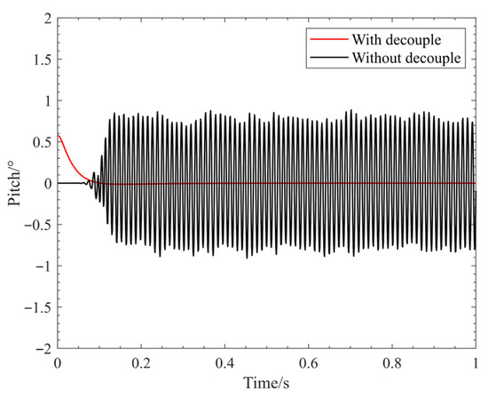 To verify the performance of the geometric feature transformation-based decoupling controller under nonlinear conditions, the simulation directly used the full-order nonlinear magnetic suspension model as the controlled plant (i.e., without linear approximation). The controller parameters in Equations (35) and (36) are set as , , , , , . Figure 9 shows a comparison of the results under two control strategies. Under the independent control strategy, the pitch attitude angle exhibits sustained constant-amplitude oscillations with a steady-state amplitude of 1.8°, indicating that the pitch-vertical coupling mode of the un-decoupled system is not effectively suppressed. In contrast, under the geometric feature transformation-based decoupling controller, the pitch angle rapidly converges from an initial offset of 0.57° to the target value of 0° without overshoot or oscillation. The response curve shows strictly monotonic convergence characteristics throughout both the transient adjustment and steady-state phases. Thus, the proposed decoupling controller overcomes the stability limitations of traditional independent control and achieves dynamic decoupling of the vertical/pitch channels in a strongly nonlinear system.