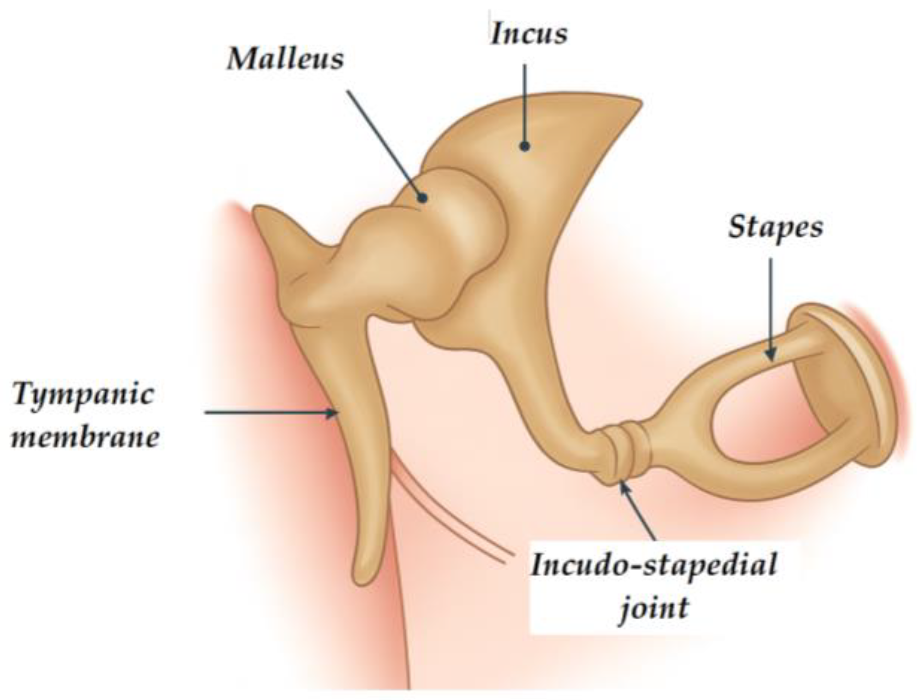 - George, T.; Fakoya, A.O.; Bordoni, B. Anatomy, Head and Neck, Ear Ossicles; StatPearls: Petersburg, Russia, 2024. [Google Scholar]
