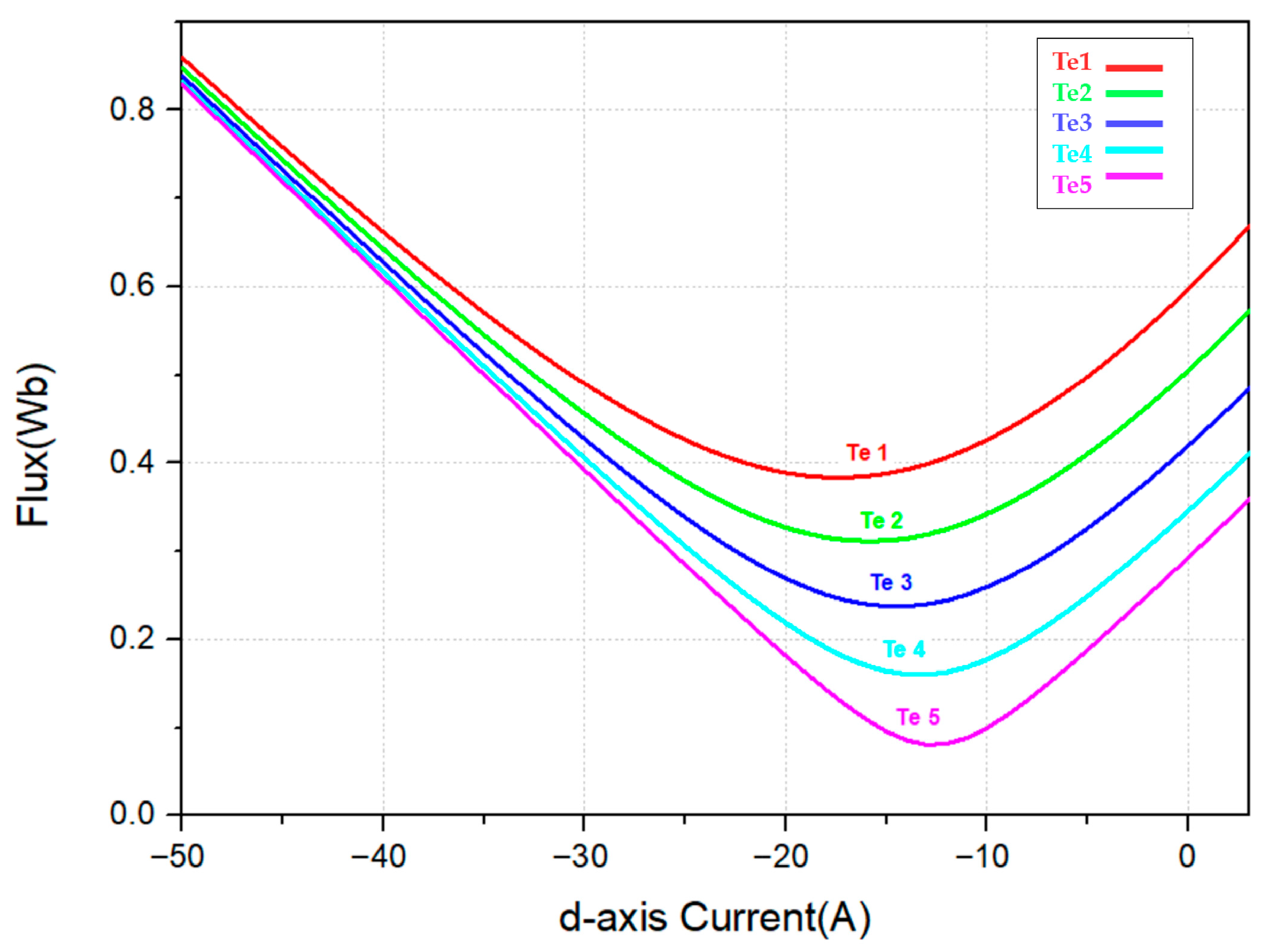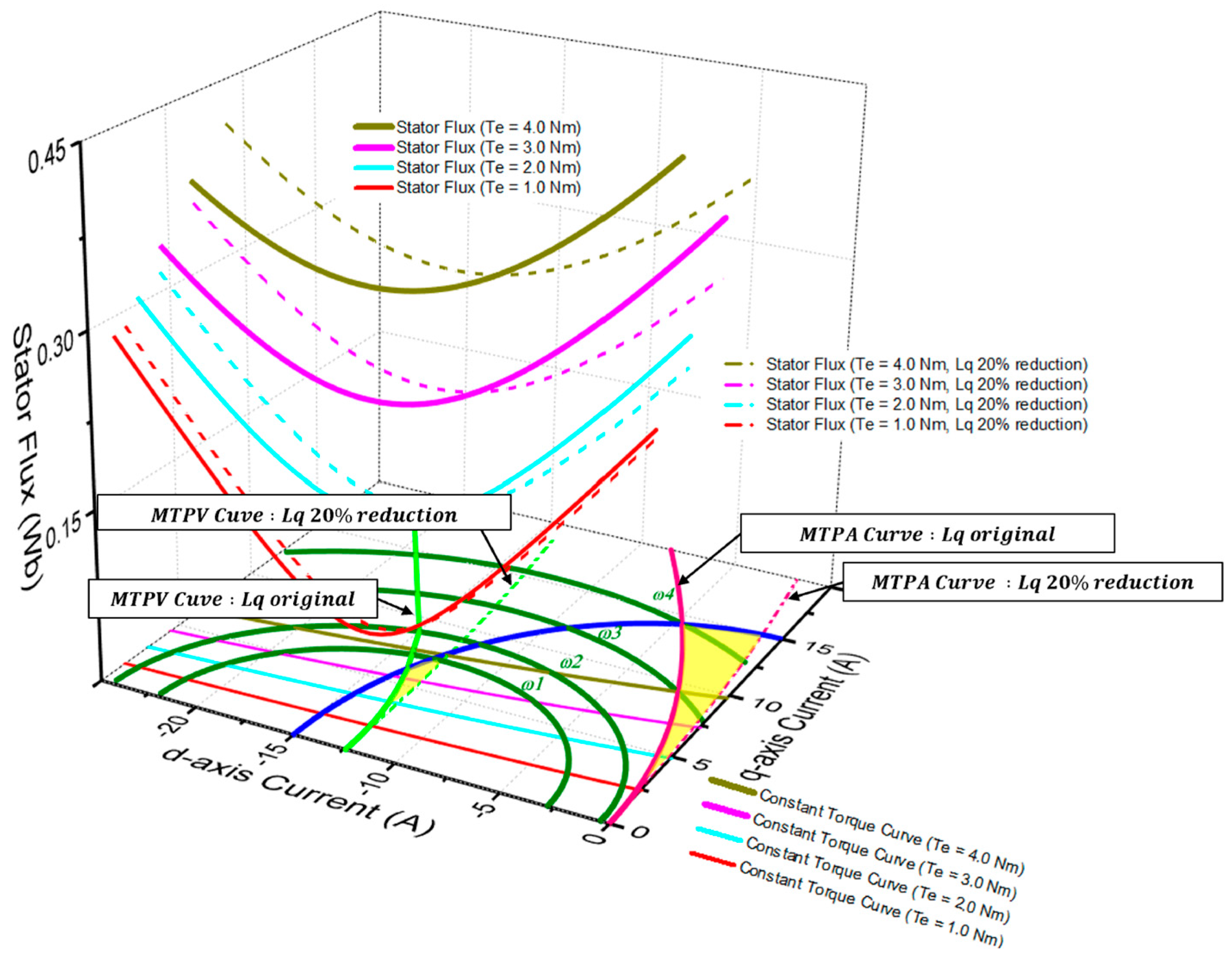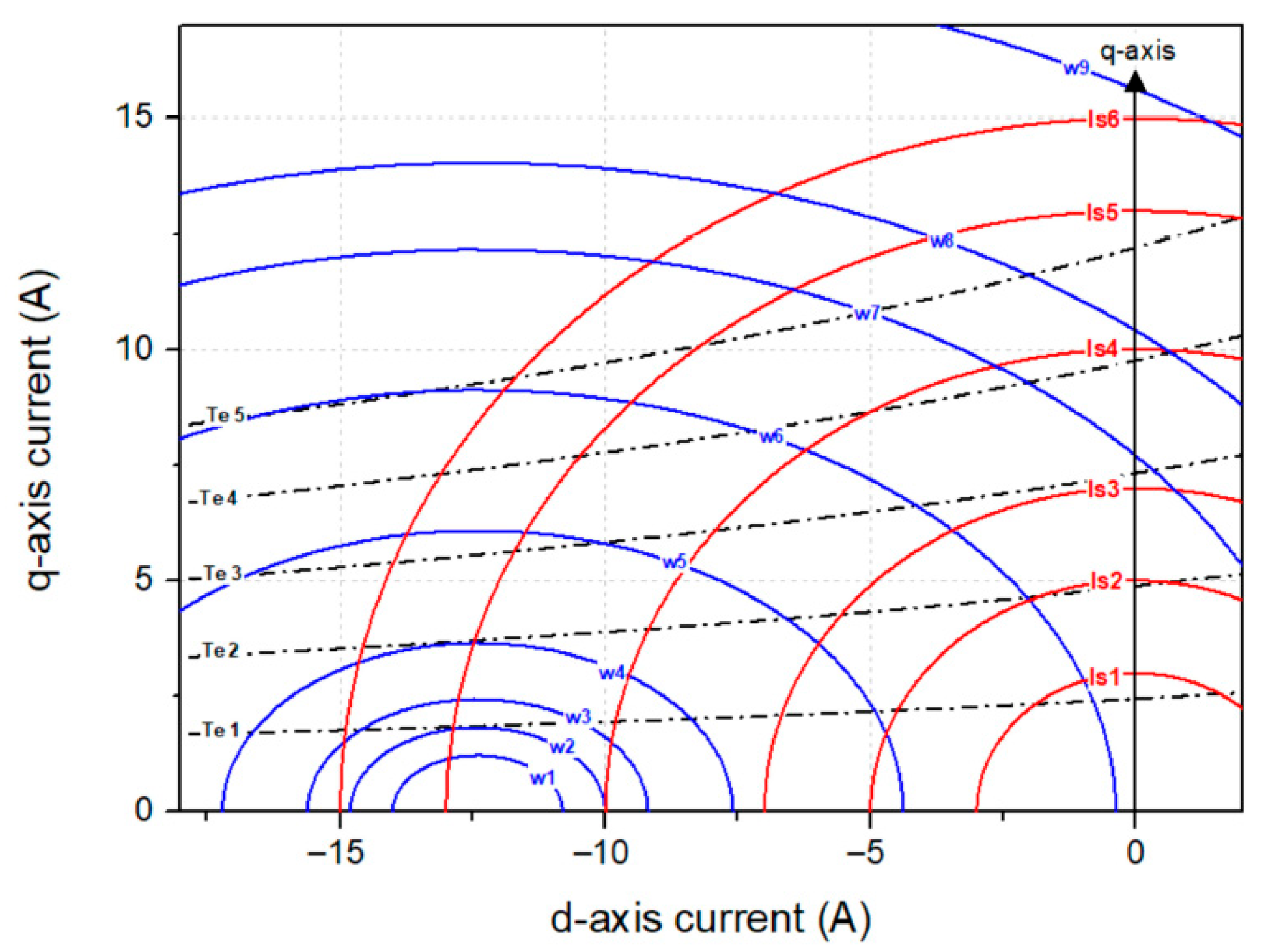 . To analytically determine the maximum output torque when the stator current magnitude is minimized, the relationship between the maximum torque per unit current and the d- and q-axis current references is expressed in Equation (19), it can be observed that the d- and q-axis current values that produce the maximum torque per unit current satisfy a quartic equation, indicating that four mathematical solutions exist for the current values corresponding to maximum torque [