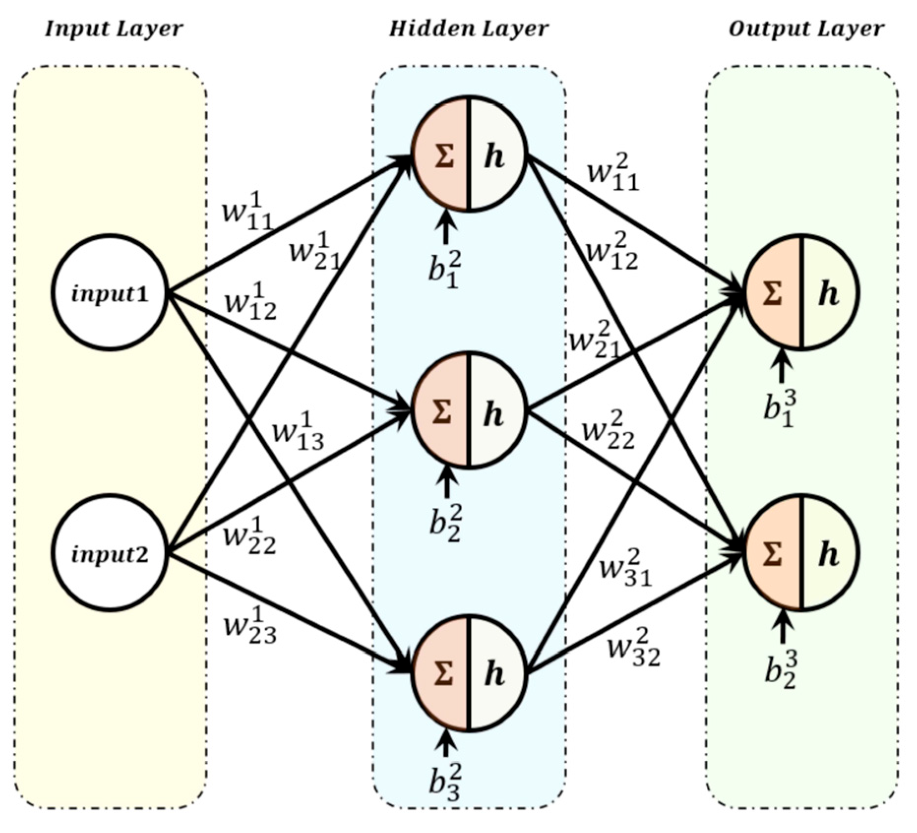 An artificial neural network (ANN) fundamentally consists of three types of layers: an input layer, one or more hidden layers, and an output layer. Each layer is composed of multiple neurons, which serve as the basic processing units.