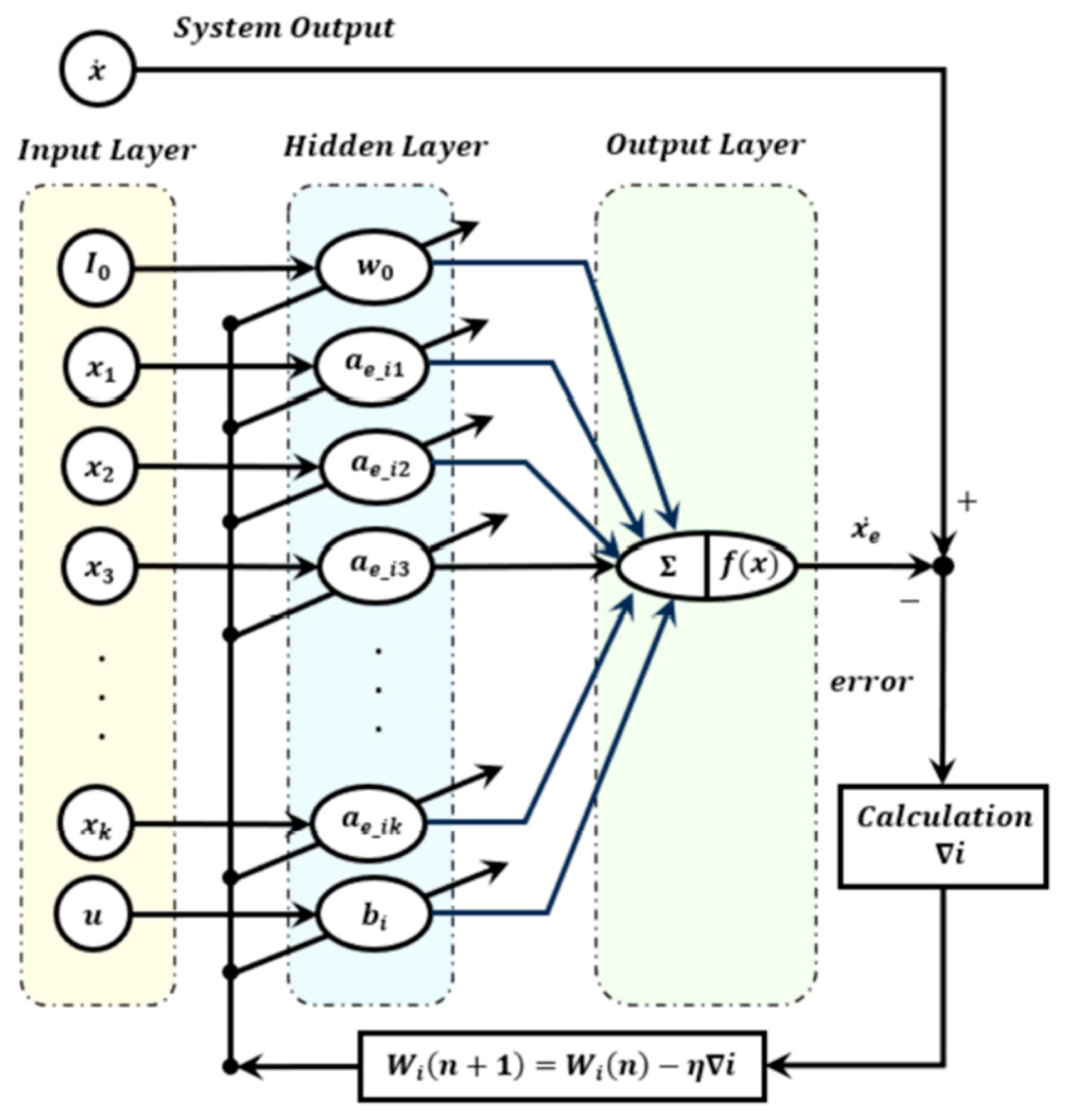 Subsequently, the gradient descent method employed in the artificial neural network is used to minimize the error between the actual system output and the SLBPNN output. The error function is expressed in Equation (8). Furthermore, when the error function in Equation (9) is represented in terms of the weights and the input values from the ANN input layer, it can be reformulated as shown in Equations (8) and (9). By applying the system state equation in Equation (8) to the least squares–based error minimization method described in Equation (10), the resulting expressions can be derived as in Equation (10). The proposed SLBPNN in this study aims to update the weights by minimizing the error defined in Equation (10). This process is carried out through the gradient descent method, in which the error function is partially differentiated with respect to the weights. The resulting weight update equations are presented in Equation (11).