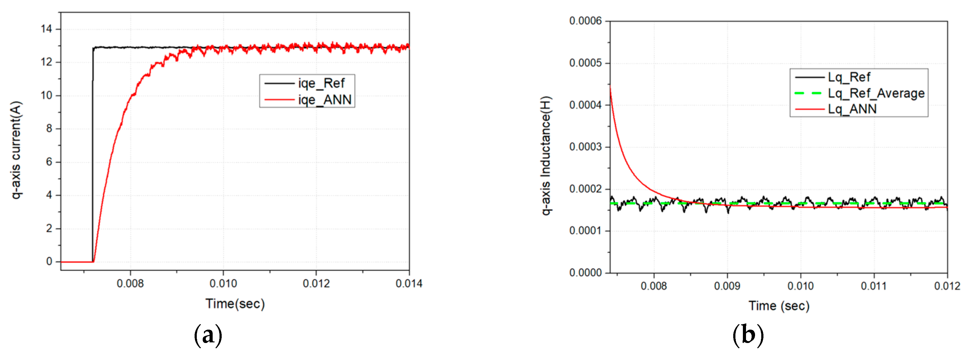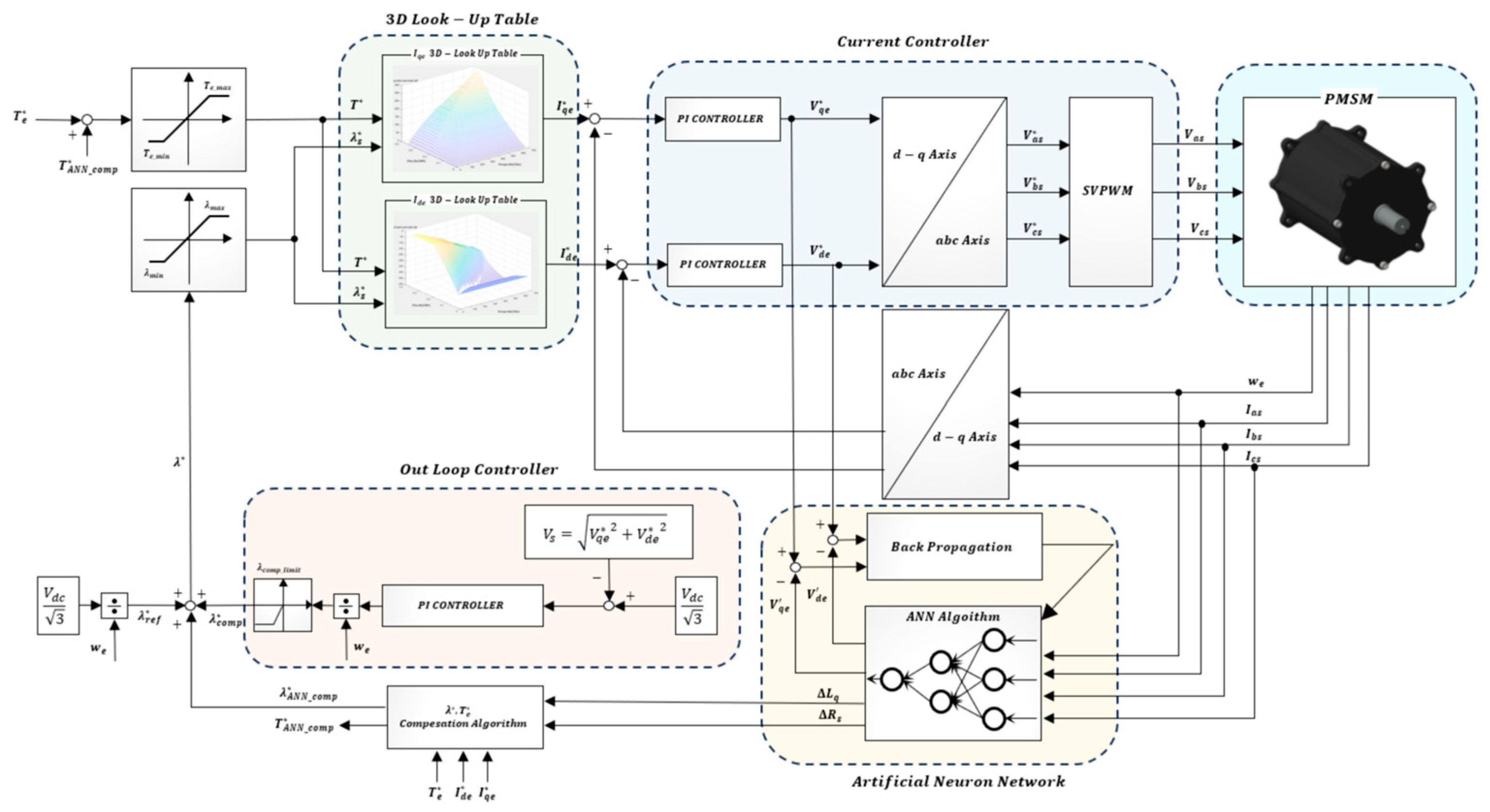 26]. However, since the PMSM motoring operation region is limited to the second quadrant of the d-q current plane, the valid d-q current combination converges to a single operating point. The optimal d-axis current reference is derived under the Maximum Torque Per Ampere (MTPA) condition in Equation (19). Based on this, the proposed flux compensation strategy calculates the d-axis current reference using the q-axis current reference obtained from the torque compensation process and the parameters estimated via the SLBPNN method, as expressed in Equation (19). The calculated d-axis current reference and the torque reference are then substituted into Equation (6) from the previous section to determine the flux reference value required to achieve the optimal torque output. Furthermore, by substituting the inductance variation in the PMSM estimated through the proposed SLBPNN into Equation (6), it is possible to obtain the compensated flux reference value corresponding to the operating region altered by the parameter variation in the motor. By applying this compensated flux value, together with the original flux reference, to the flux-based PMSM torque control lookup table (LUT), the proposed method can effectively compensate for the reduction in output efficiency caused by the parameter-induced shift in the operating region during motor operation. Ultimately, this approach enables compensation of both the d- and q-axis operating points for improved PMSM performance under varying conditions, as shown in