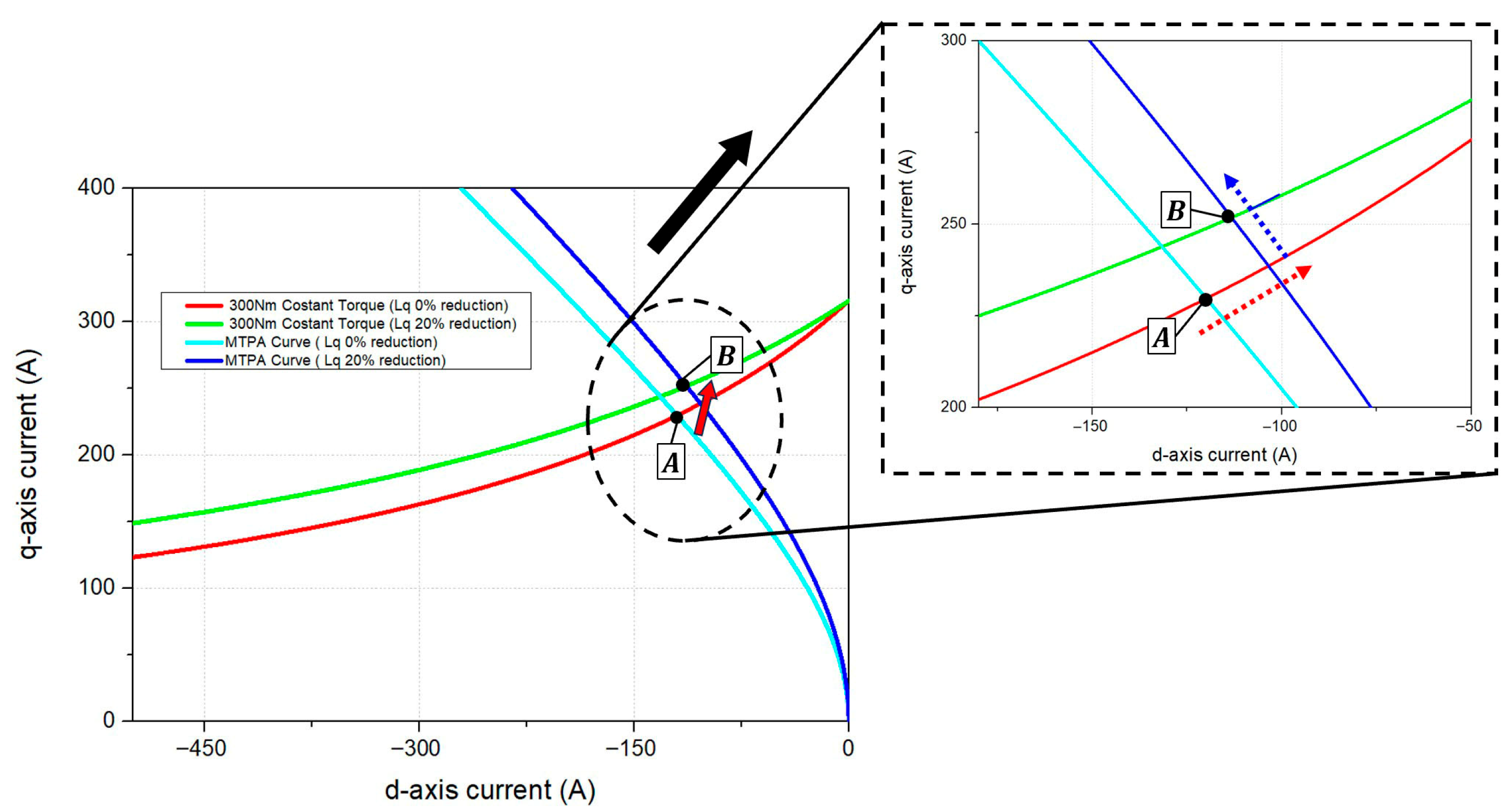 Figure 10 illustrates the change in the MTPA curve and the constant output torque curve on the d-q current plane when parameter variations occur. In the case where the q-axis inductance decreases by 20%, it can be observed that, to produce the same torque reference, the operating point must shift from point A to point B in