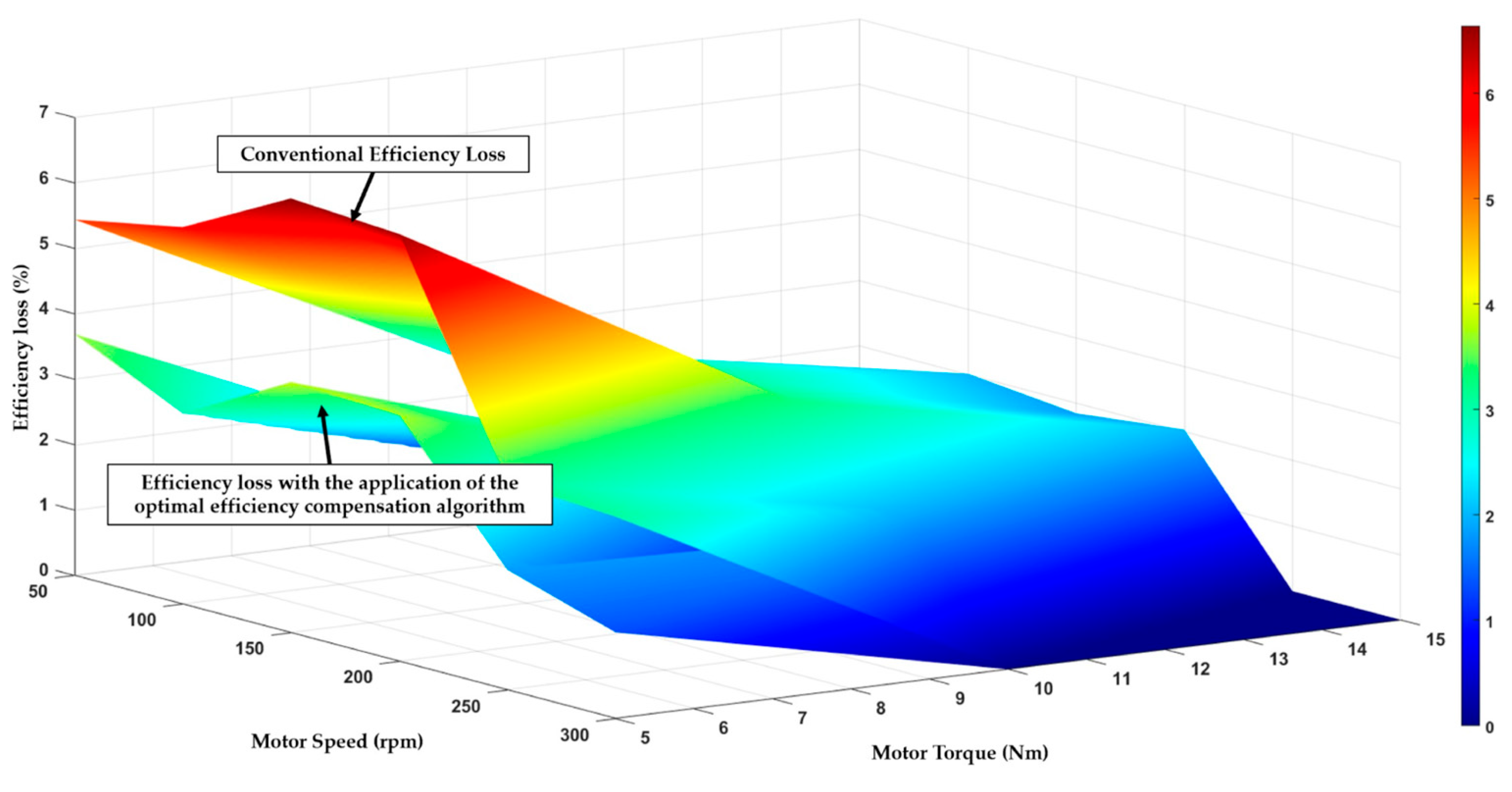 The compensation strategy proposed in this study aims to generate compensated torque and flux reference values that enable optimal operation under parameter variations. Specifically, when parameter deviations occur, the algorithm adjusts the current flux–torque references to maintain optimal operating conditions. The mathematical formulation for the torque reference compensation is presented in Equation (17).